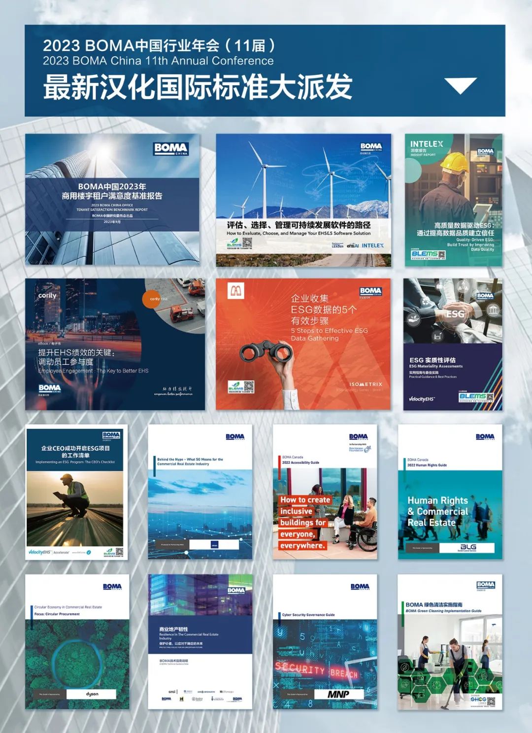 汉化国际标准派发是BOMA中国行业年会的热门环节,每年申领数量都达数千册,申领人群覆盖业主方、资管方、物管方等。2023BOMA中国行业年会预计向行业派发14本全套汉化国际标准(500套),包括ESG战略与管理系列、绿色可持续发展系列、网络安防等内容,助力行业迎战时代发展新挑战。