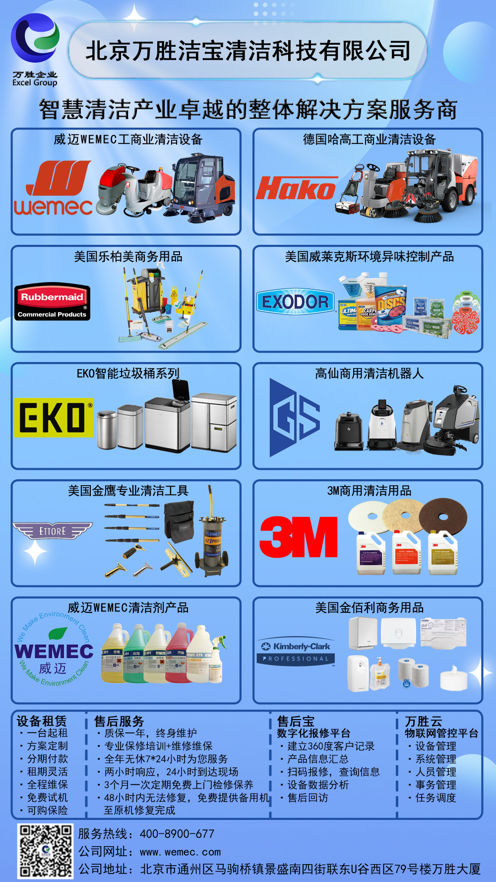 北京万胜洁宝拥有自有品牌,威迈清洁设备、清洁剂及清洁工具;同时更是多家知名品牌清洁用品的代理商,包括哈高、高仙、云象、天尼、乐柏美、威莱克斯、金佰利、EKO、金鹰、3M等。我们还提供全系列清洁设备、清洁机器人、升降平台、高压冲洗车等设备的租赁服务。