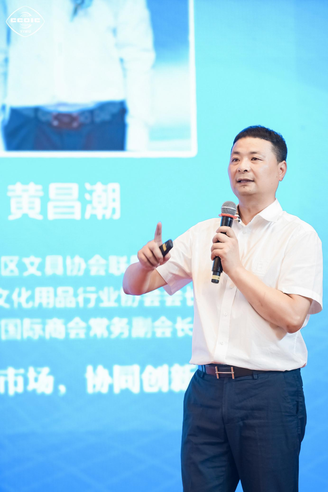 文化用品行业协会会长、鼎文展览董事长黄昌潮分享《抱团出海抢市场,协同创新创未来》。