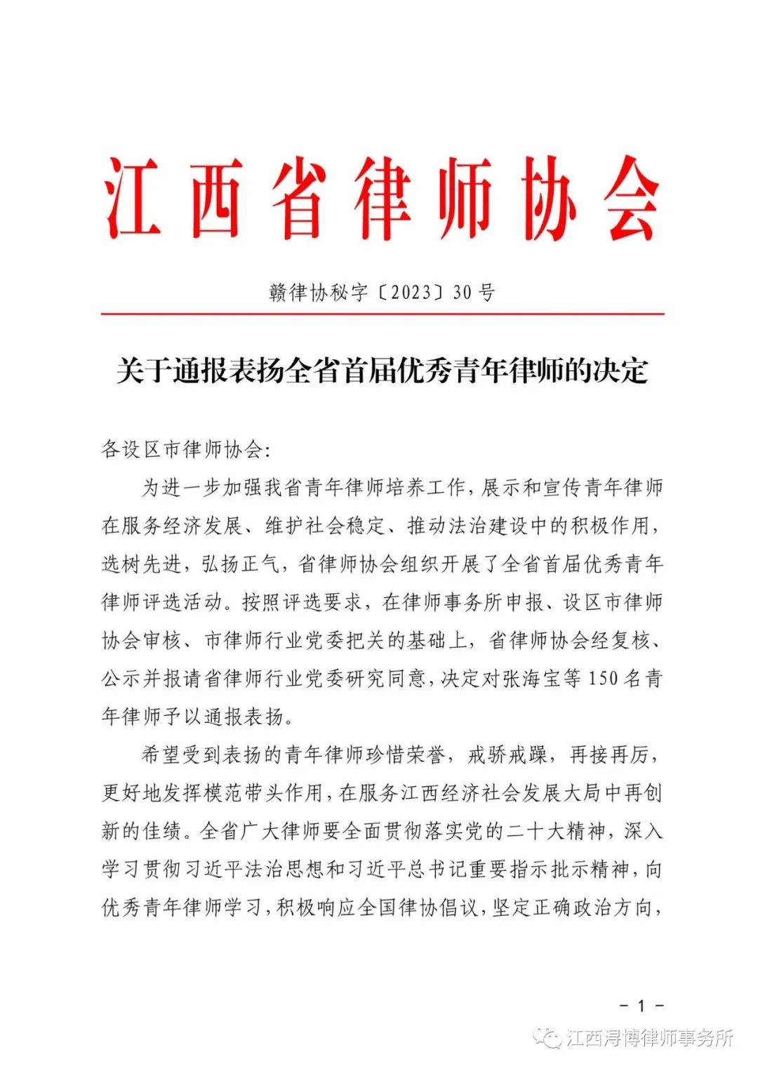 为进一步加强我省青年律师培养工作,展示和宣传青年律师在服务经济发展、维护社会稳定、推动法治建设中的积极作用,选树先进,弘扬正气,省律师协会组织开展了全省首届优秀青年律师评选活动。按照评选要求,在律师事务所申报、设区市律师协会审核、市律师行业党委把关的基础上,省律师协会经复核、公示并报请省律师行业党委研究同意,决定对张海宝等 150 名青年律师予以通报表扬。