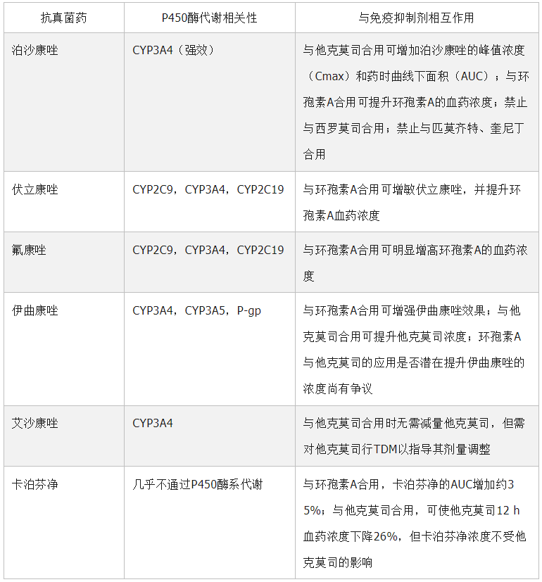 表1 抗真菌药物相关肝代谢酶及免疫抑制剂相互作用