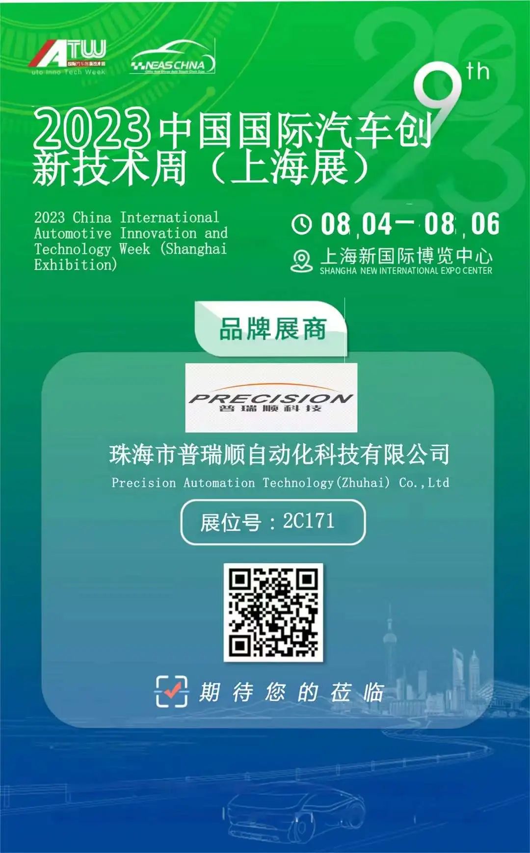IATW 2023 上海国际汽车创新技术周将于 8 月 4 日至 6 日在上海新国际博览中心举办。普瑞顺科技诚邀您届时莅临N2号馆2C171展位,进行参观指导及业务交流,我们期待您的到来!
