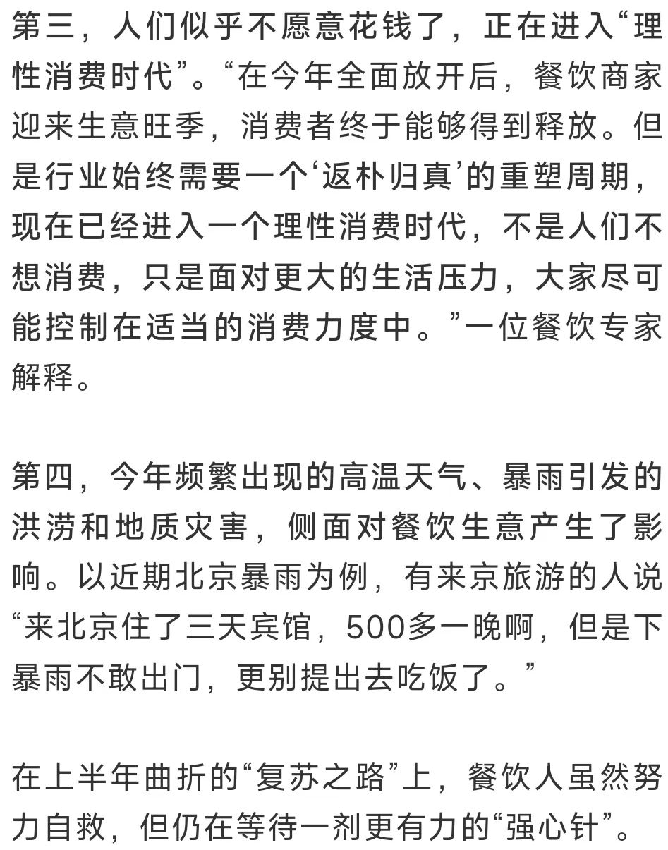 第二,上半年餐饮业价格战,让一些认真做餐饮的人无法生存。从高端餐饮到大众连锁、快餐,人均消费普降20%-30%似乎已成事实,整个行业处于内卷、焦虑的氛围中。