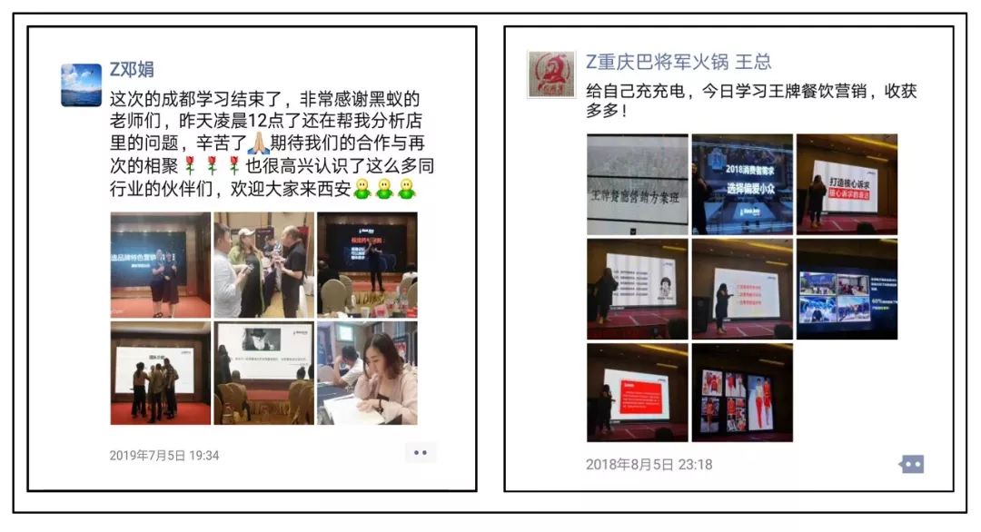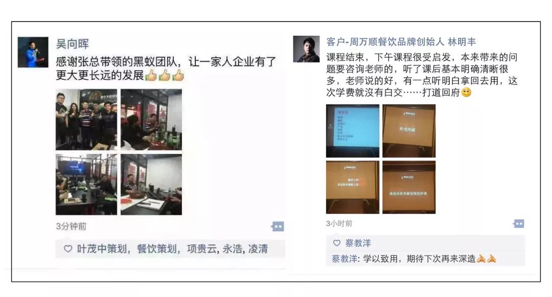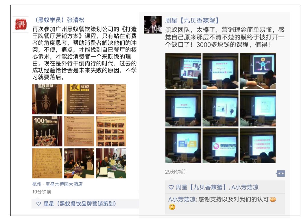 这是上期参加我们【打造餐饮氛围·系统方案班】部分学员的分享,来学习的餐饮企业感触都非常深、收获很大、由黑蚁核心策划老师针对性系统梳理、精准定位品牌,提炼品牌诉求、核心卖点,打造强势品牌特色!整个品牌策划方案的呈现,由策划老师战略把关,现场都为自己的品牌找到了很多突破点和营销方案,回去执行都能迅速提升品牌价值与营业额!