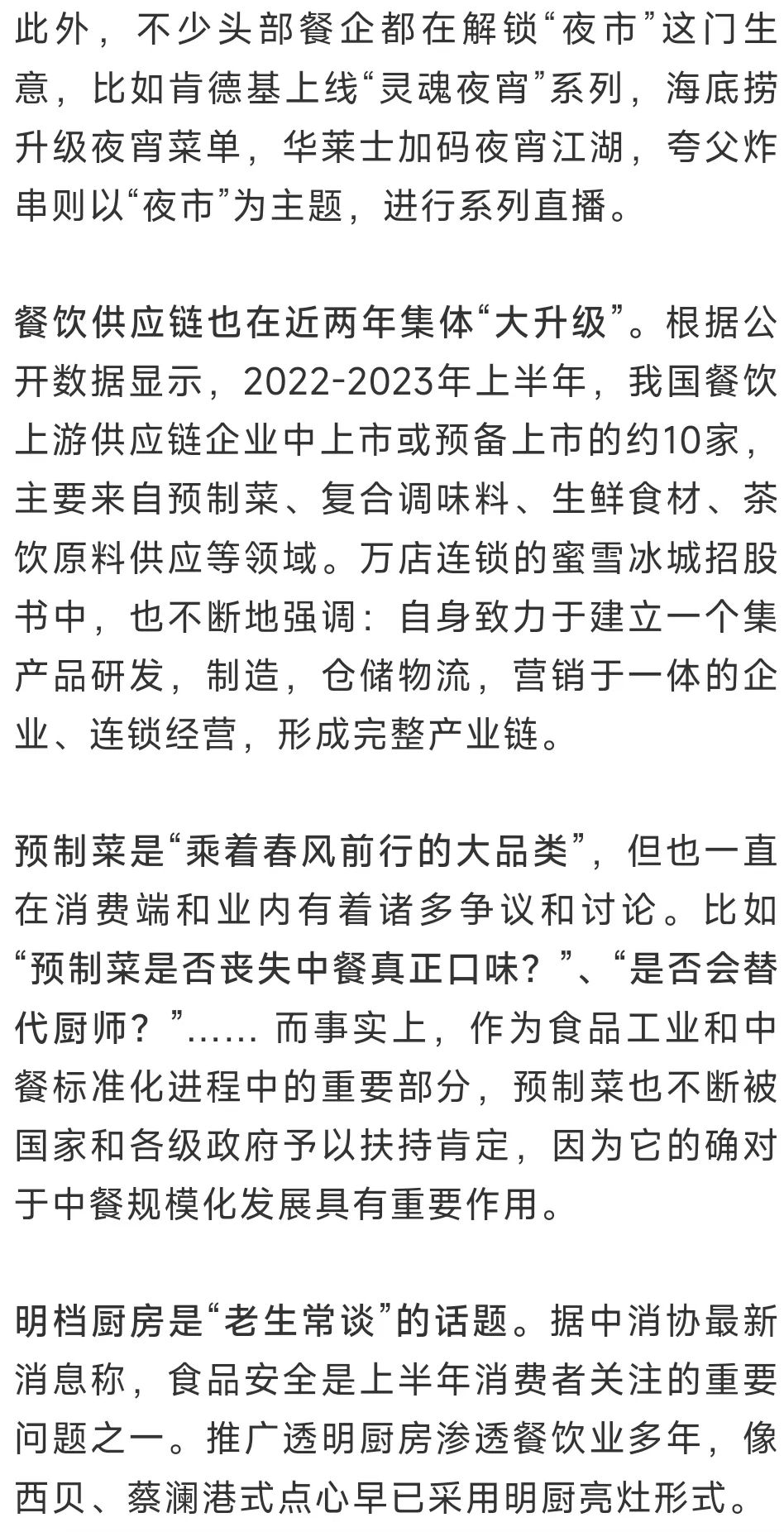 倡导健康餐饮消费、反对餐饮浪费,支持各地举办美食节,打造特色美食街区,开展餐饮促消费活动。因地制宜优化餐饮场所延长营业时间相关规定。培育“种养殖基地+中央厨房+冷链物流+餐饮门店”模式,挖掘预制菜市场潜力,加快推进预制菜基地建设,充分体现安全、营养、健康的原则,提升餐饮质量和配送标准化水平。推广透明厨房,让消费者吃得放心。