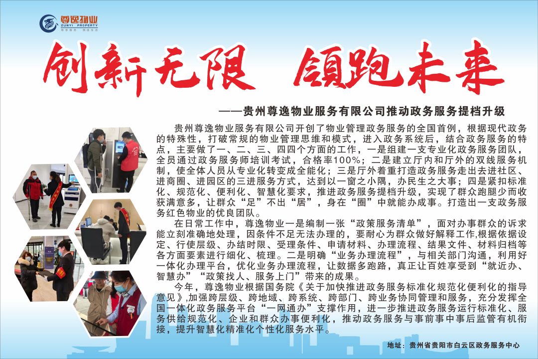 宣传:秉承“业主满意才是硬道理”的服务理念,2005年受贵阳高新技术开发区委托,是贵阳高新技术开发区成立的第一家物业管理有限公司,填补了贵州省公建类物业行业的空白。