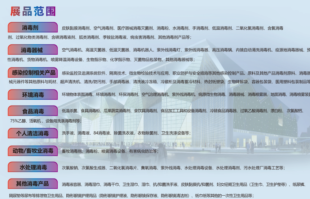 展区:医用消毒展区、消毒用品展区、消毒设备展区、消毒包装展区、感染控制及预防展区、消毒感控自动化展区等