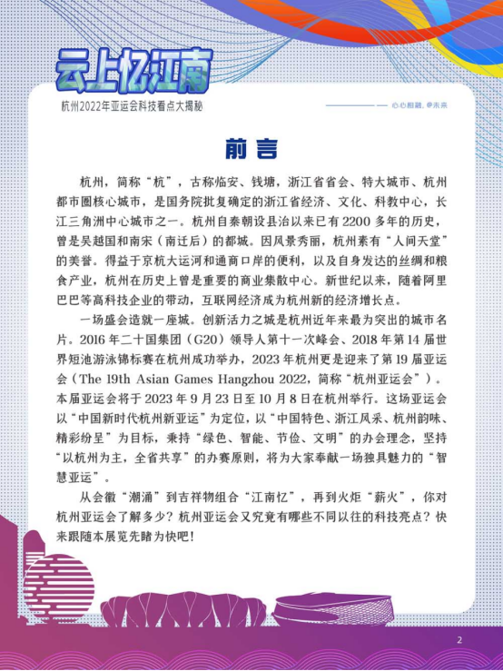 一场盛会造就一座城。“创新活力之城”是杭州近年来最为突出的城市名片。2016年二十国集团领导人第十一次峰会、2018年第14届世界短池游泳锦标赛在杭州成功举办,2022年杭州更是迎来了第19届亚运会。本届亚运会将于2022年9月10日至25日在杭州举行。这届亚运会以“中国新时代•杭州新亚运”为定位,以“中国特色、浙江风采、杭州韵味、精彩纷呈”为目标,以“绿色、智能、节俭、文明”为办会理念,坚持“以杭州为主,全省共享”的办赛原则,将为大家奉献一场独具魅力的智慧亚运。从会徽“潮涌”到吉祥物组合“江南忆”,再到火炬“薪火”,你对杭州亚运会了解多少?杭州亚运会又究竟有哪些不同以往的科技亮点?快来跟随本展览先睹为快吧!