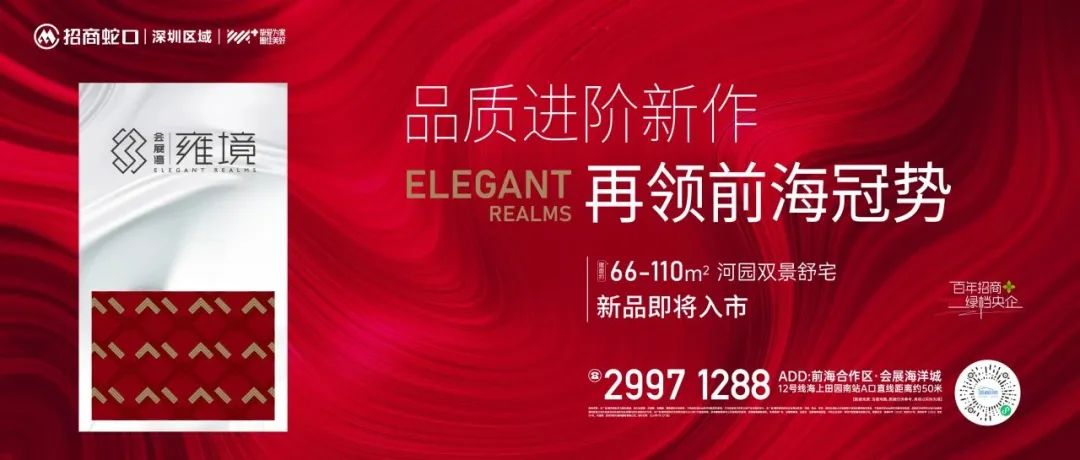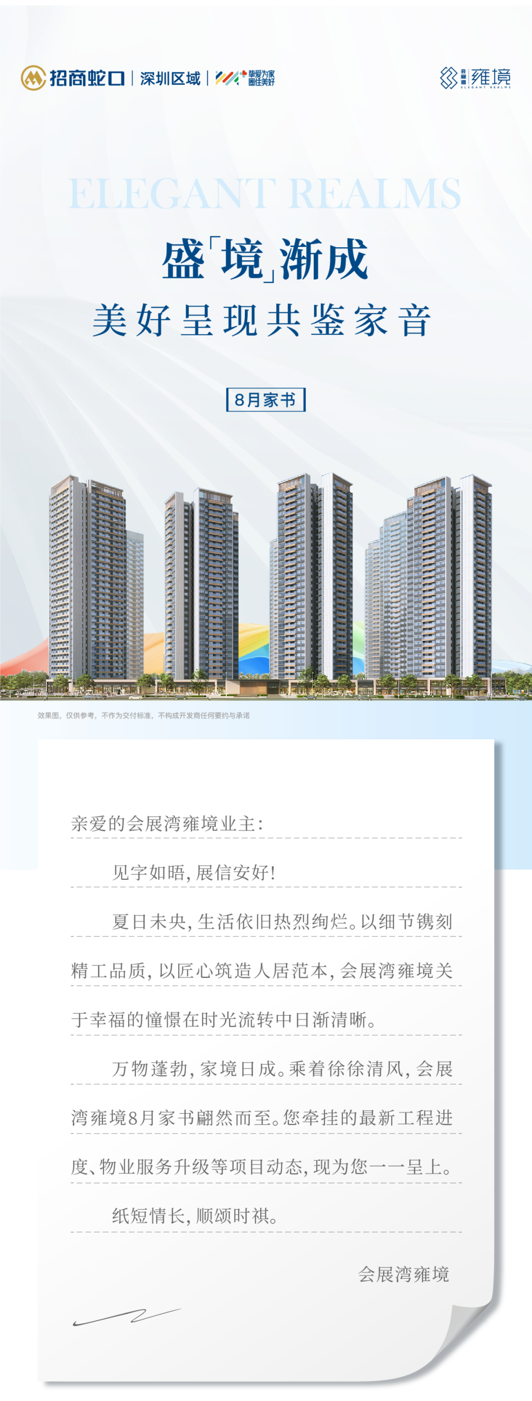 免责声明:本⼴告/宣传资料仅为要约邀请,其中效果图、示意图、实景图、模型展示仅供参考,不构成开发企业的任何要约和承诺,不对买卖双方权利义务产生任何约束力;本⼴告/宣传资料所涉及对周边环境、交通、商业、学校、规划及其他公共设施等介绍旨在提供相关信息,不构成开发企业的任何要约和承诺,买卖双方的权利义务以政府的最终批准文件及买卖合同及相关协议所载内容及实际交付为准。本广告/宣传资料所发布的内容为2023年8月前的信息,如有最新信息本公司有修改的权利,敬请留意最新资料。本项目推广名:会展湾雍境,注册名:会展湾雍境花园,开发企业名称:深圳市招雍置业有限公司。预售证号:深房许字(2023)宝安007号;深房许字(2023)宝安011号。制作日期:2023年8月【广告】