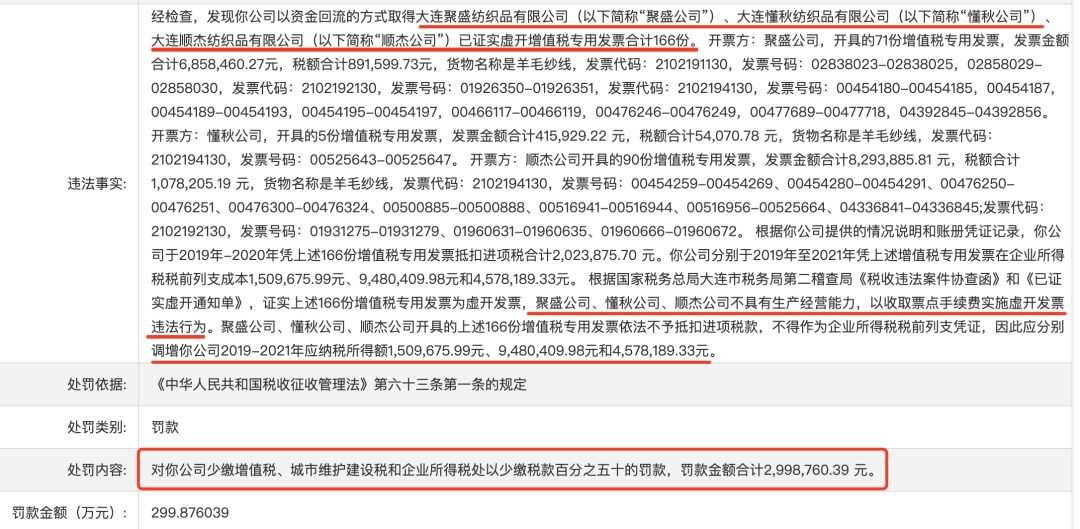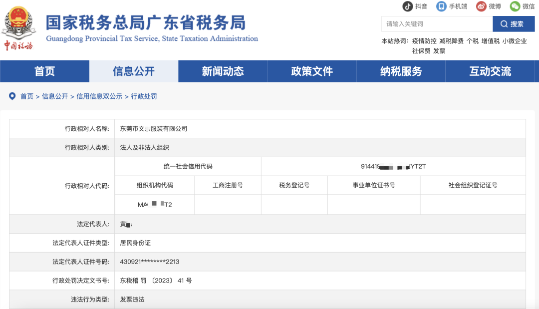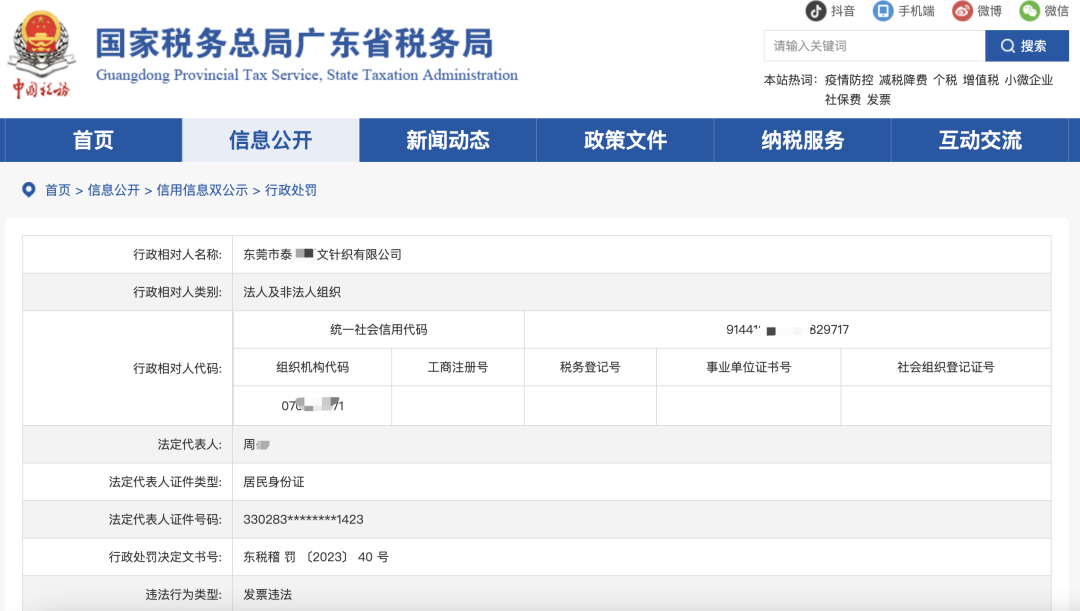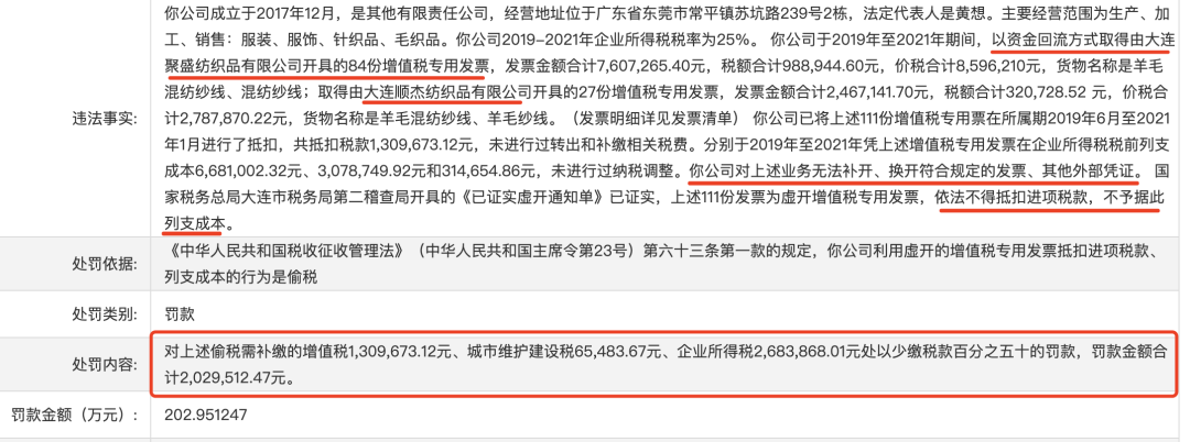 近日,广东国税局在官网上公布了东莞两家服装生产公司的处罚通知。其中东莞市泰**文针织有限公司不仅被调整2019-2021年应纳税所得额,还要被罚299万余元;东莞市文*服装有限公司则因无法补开、换开符合规定的发票、其他外部凭证,被判不得抵扣进项税款,不予据此列支成本,同时还要被罚202万余元。而仔细查看了这两家的处罚通知后,可以很明显的看到,他们所收到的虚开发票是由同样的几家上游公司开出来的……