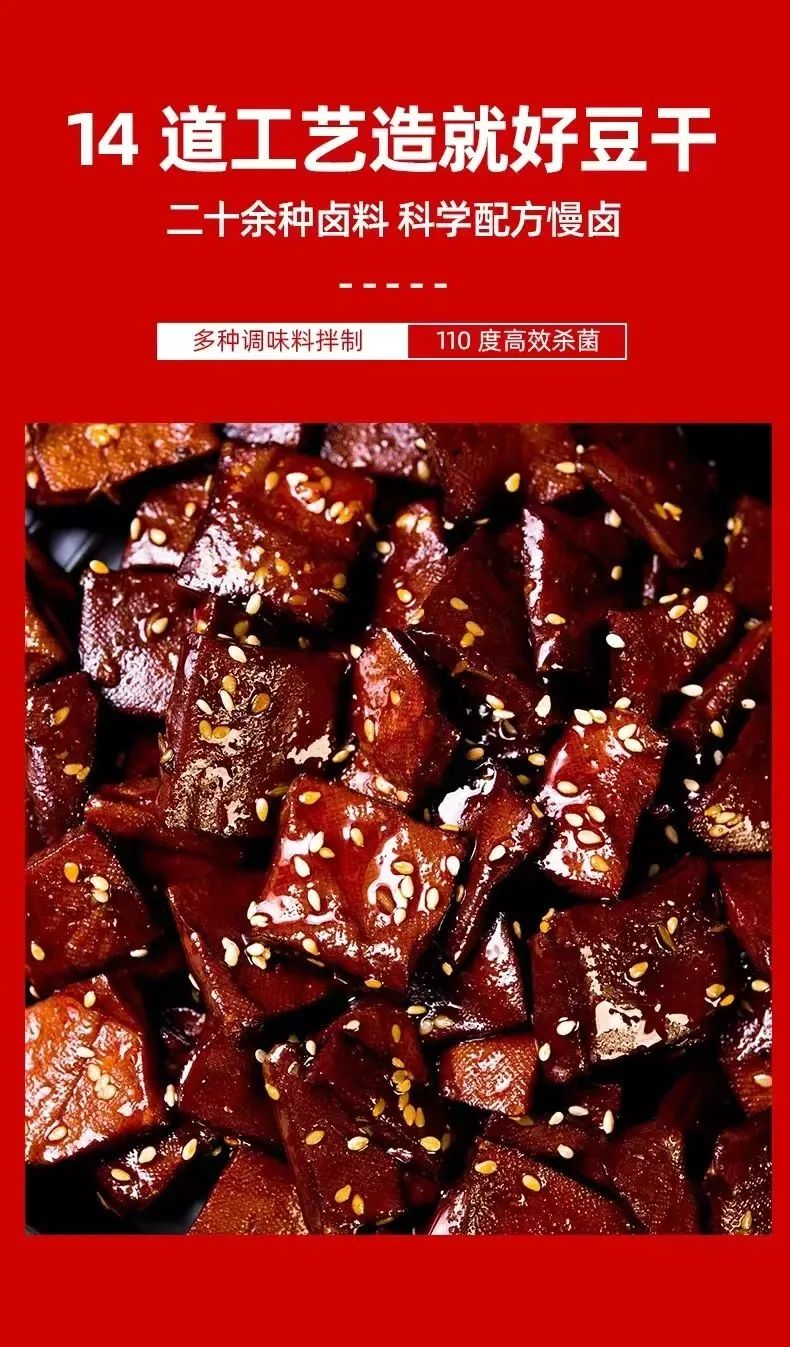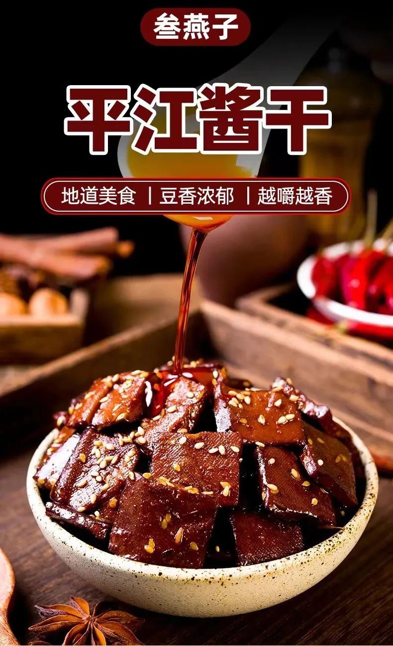 品牌介绍:平江酱干也叫平江豆干,酱干起源于湘鄂赣边塞重镇岳阳市平江县,又名长寿酱干,是清咸丰年间百岁老人何维丰首创,参燕子平江酱干秉承了平江老酱干的古法工艺流程,传统制作方式,因此酱干的豆香和卤香味都非常浓郁