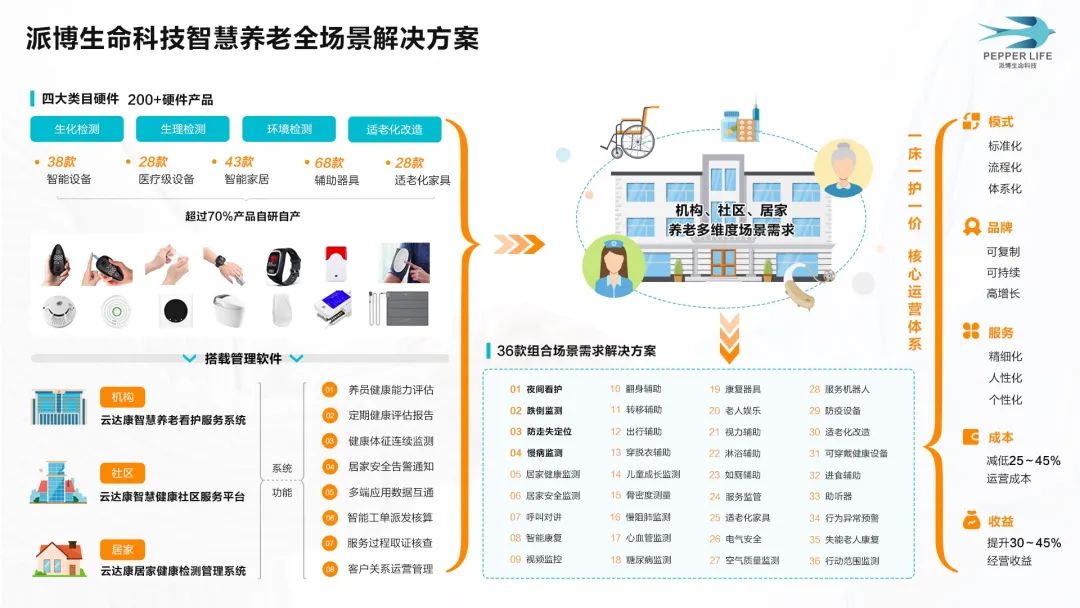 派博重新定义并提供了涵盖夜间看护、慢病监测、跌倒监测等标准化、流程化、体系化的36大场景方案,解决大健康养老市场发展中面临的多层次、多维度、多元化需求,守护老人健康,助力智慧养老发展。