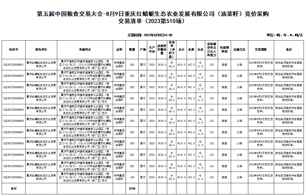 受重庆红蜻蜓生态农业发展有限公司委托,重庆市粮油批发市场有限责任公司(即国家粮食重庆交易中心,以下简称“批发市场”)定于2023年8月9日10:00举办重庆红蜻蜓生态农业发展有限公司(油菜籽)竞价采购交易会,现将有关事项公告如下: