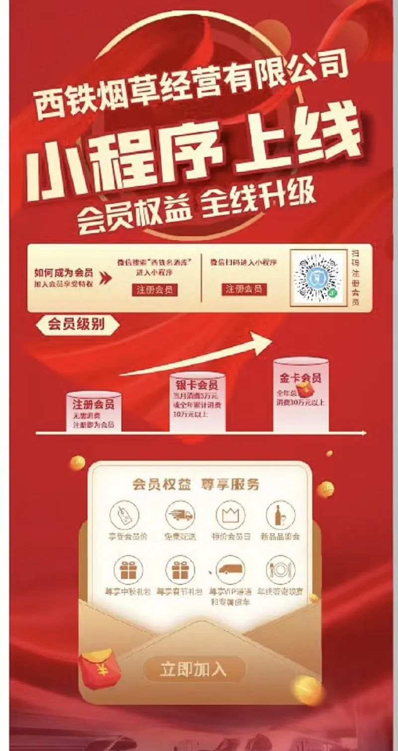 升级银卡会员在此基础上可尊享新品上市品鉴、年终答谢晚宴及抽奖、领取伴手礼。升级金卡会员更可尊享中秋、春节礼包和西安车站、北站的两次VIP通道和专属候车服务两次等丰厚的会员礼遇。同时,烟草公司让利线上客户,特推出邓霞玲买一赠一活动(线下仍为买二赠一);夜郎春秋、小茅1935买一赠一等促销活动。并特设了婚宴专区,为客户全方位提供优质和定制化服务。答:使用微信扫描下方二维码,打开“西铁名酒库”小程序,输入姓名和联系电话,点击入会,即可成为会员啦!
