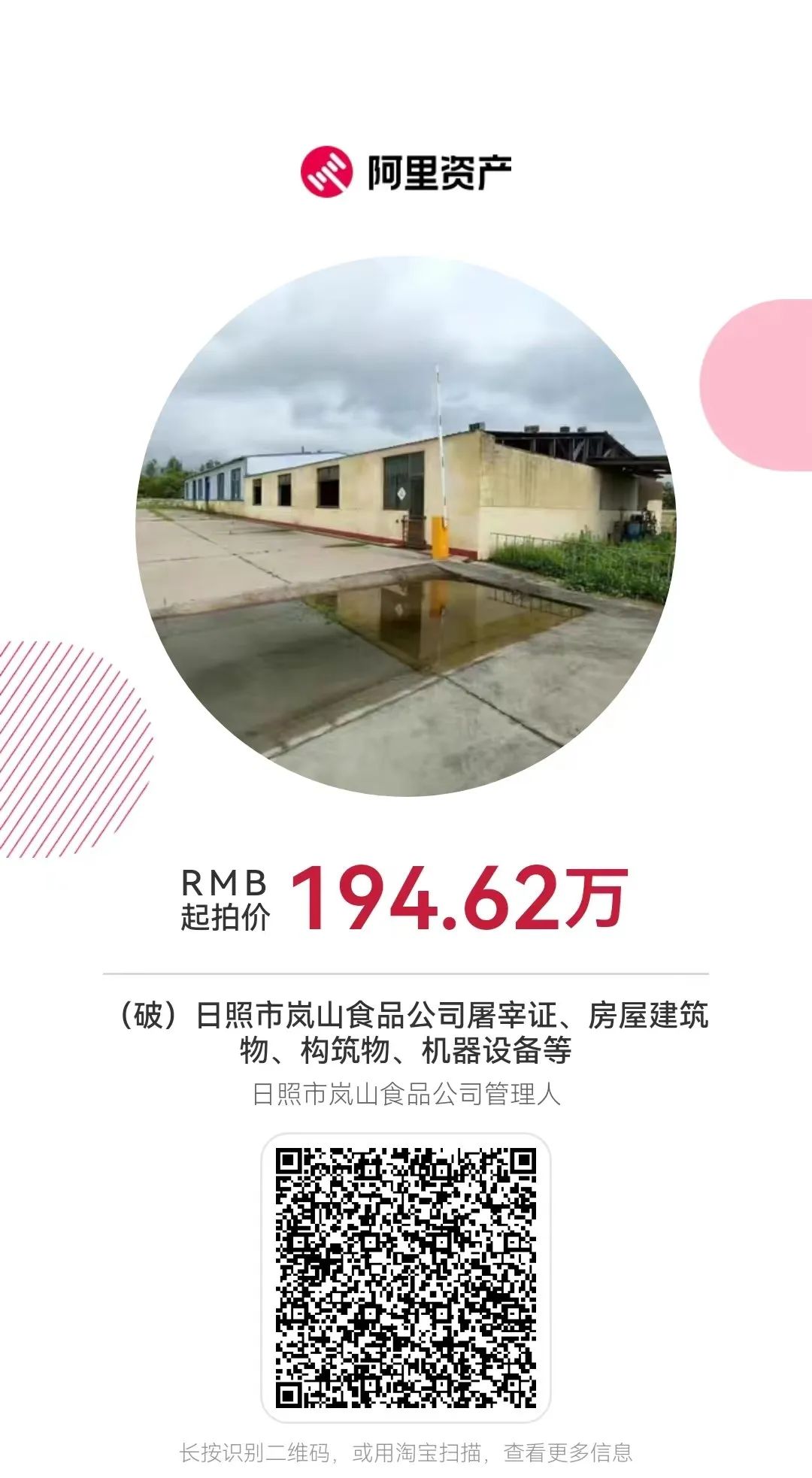 日照市岚山区人民法院于2021年7月19日裁定受理日照市岚山食品公司的破产清算申请,并于2021年12月30日裁定宣告破产。公司管理人将于2023年8月16日10时至2023年 8月17日10时止(延时除外)在淘宝网司法拍卖网络平台上进行公开拍卖活动,现公告如下:
