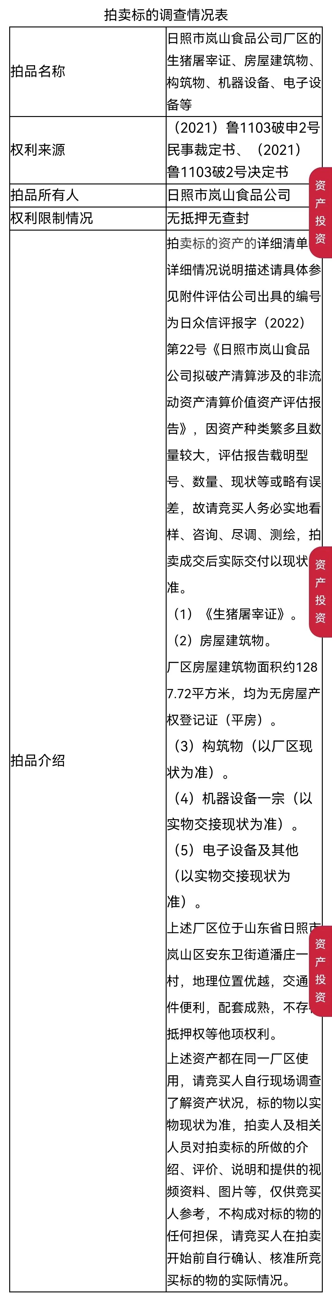 本次拍卖标的为日照市岚山食品公司厂区的生猪屠宰证、房屋建筑物、构筑物、机器设备、电子设备等。因资产种类繁多且数量较大,评估报告载明型号、数量、现状等或略有误差,故请竞买人务必实地看样、咨询、尽调、测绘,拍卖成交后实际交付以现状为准。