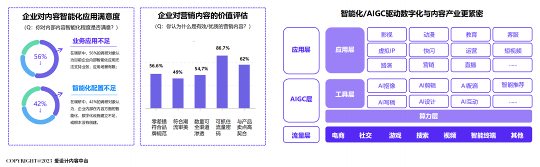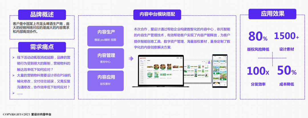 爱设计内容中台作为内容创意全链路的服务平台,整合版权资源→创意服务→智能生产工具箱→内容资产管理工具→内容分发→数据抓取→数据分析的链路,力图打造品牌最值得信赖的内容中台服务商。逐渐开放的社会环境,留给企业的思索空间已收缩,尽快投入趋势,才是拥抱市场的最佳选择。