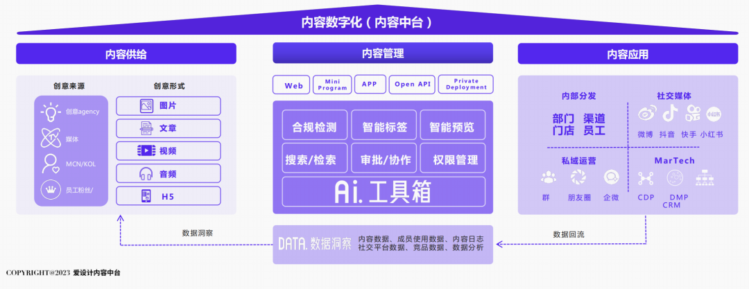 品牌管理者具有前瞻性的数字化思维,在内容数字化上有清晰的布局要求,最终通过内容中台的优化设置,从内容的生产、管理、分发三大环节,实现内容的存储/上传——数字化管理——在线智能创意——分享及投放管理——数据监测——数据回流分析——内容优化的内容全链路数字化。