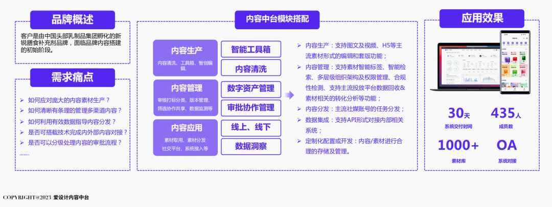 以可持续发展的百年企业为目标,食品饮料行业其中所积累的内容可以以指数级、海量形容。集内容的供给、管理、分发、洞察于一体,解决内容从哪来、对不对、用没用、有没有效的内容全链路问题是每个阶段精准营销的关键。提高内容管理的有效性和流转效率、通过内容的数据表现反哺内容生产,规避版权和规范性风险,提高用户留存率或许可帮助企业更快的达到内容数字化、营销一体化的目标。