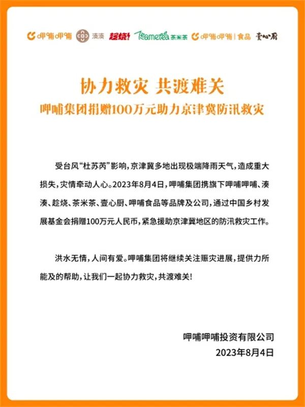 呷哺集团捐赠100万元助力京津冀防汛救灾