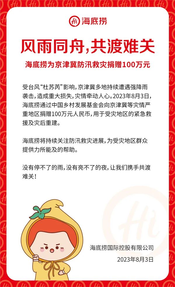 海底捞捐款100万元驰援京津冀地区防汛救灾