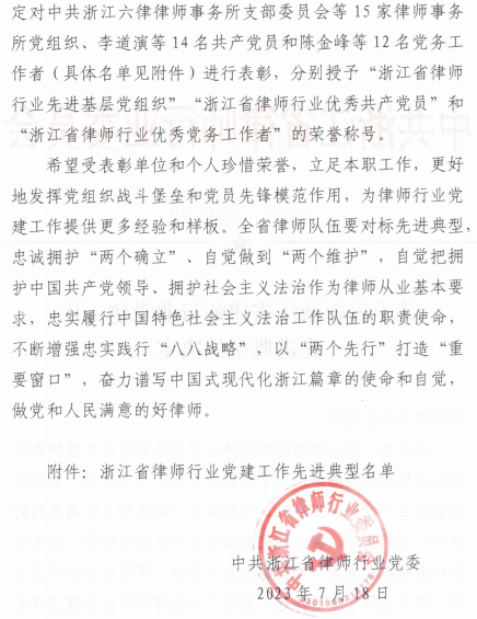 近年来,浙江律师始终坚持以习近平新时代中国特色社会主义思想为指导,深入学习贯彻党的二十大精神,紧紧围绕省委三个“一号工程”,不断深化“做党和人⺠满意的好律师”主题活动,在坚持党对律师工作的全面领导、促进经济社会高质量发展 、维护群众合法权益、保障社会公平正义等工作中发挥了重要作用,涌现了一批律师行业党建工作先进基层党组织、优秀共产党员、优秀党务工作者。在庆祝中国共产党成立102周年和全党深入开展学习贯彻习近平新时代中国特色社会主义思想主题教育之际,为充分发挥律师行业党建工作先进典型的示范引领作用,省律师行业党委研究决定对15家律师事务所党组织、14名共产党员和12名党务工作者进行表彰 ,分别授予“浙江省律师行业先进基层党组织”“浙江省律师行业优秀共产党员”和“浙江省律师行业优秀党务工作者”的荣誉称号。