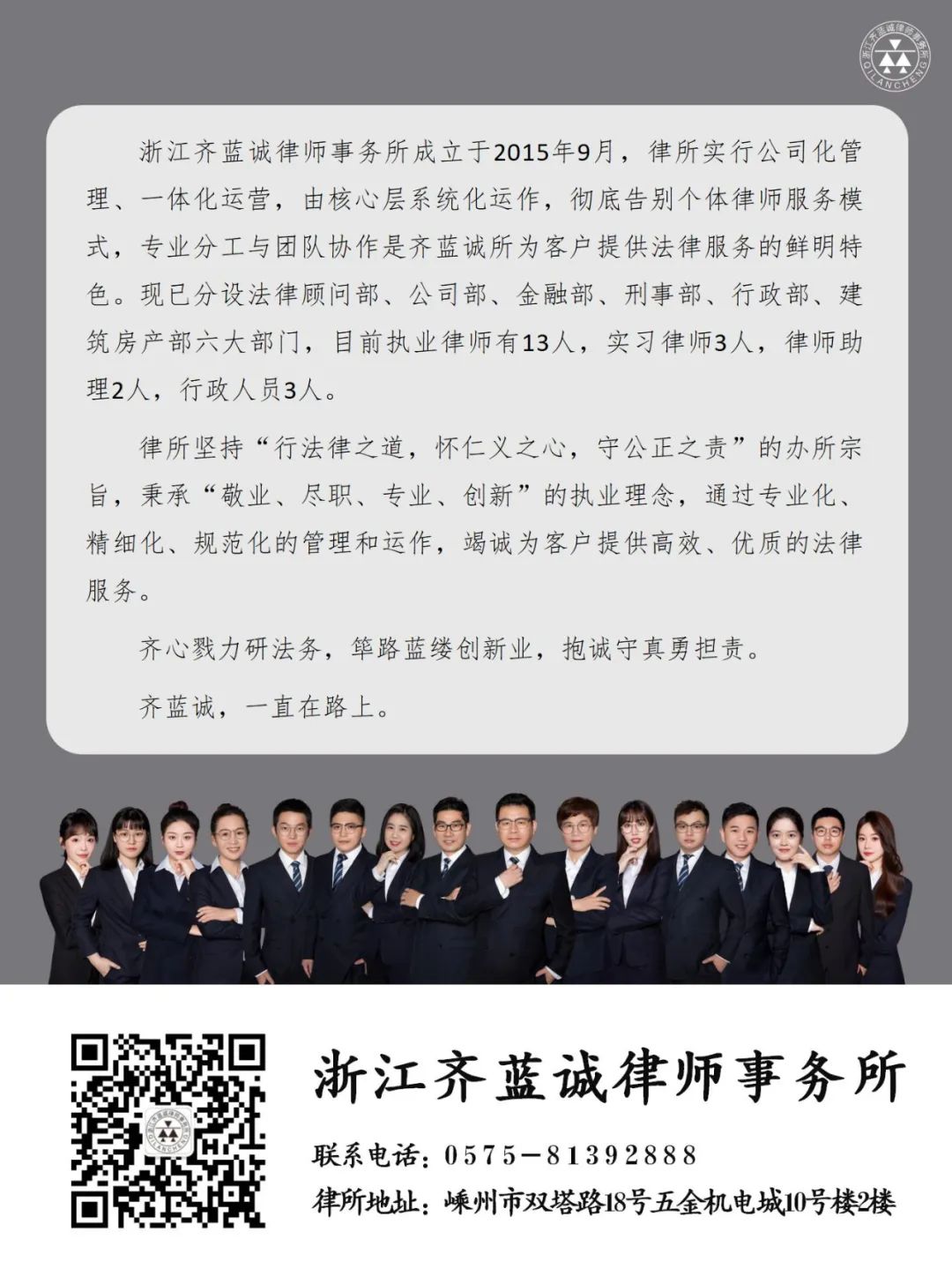 浙江齐蓝诚律师事务所党支部成立于2016年12月15日,目前共有党员9人。律所始终坚持党建引领,以打造“一心五化” 队伍为目标,即胸怀“爱党爱国,敬畏法律”之心,形成一支团队化、专业化、产品化、精细化、规范化的律师队伍。