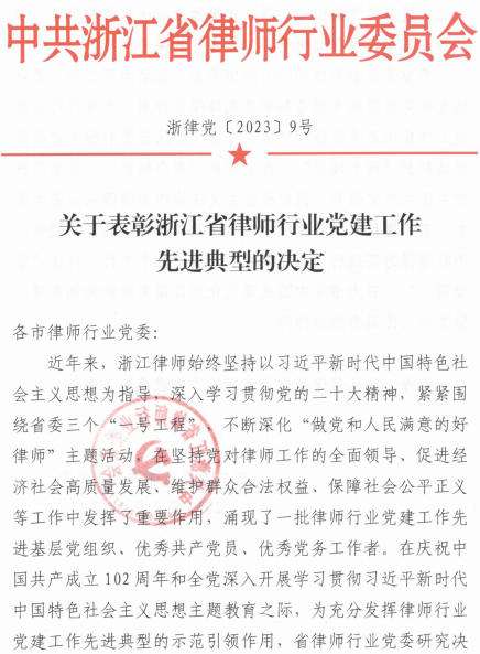 我所党支部荣获“浙江省律师行业先进基层党组织”称号。