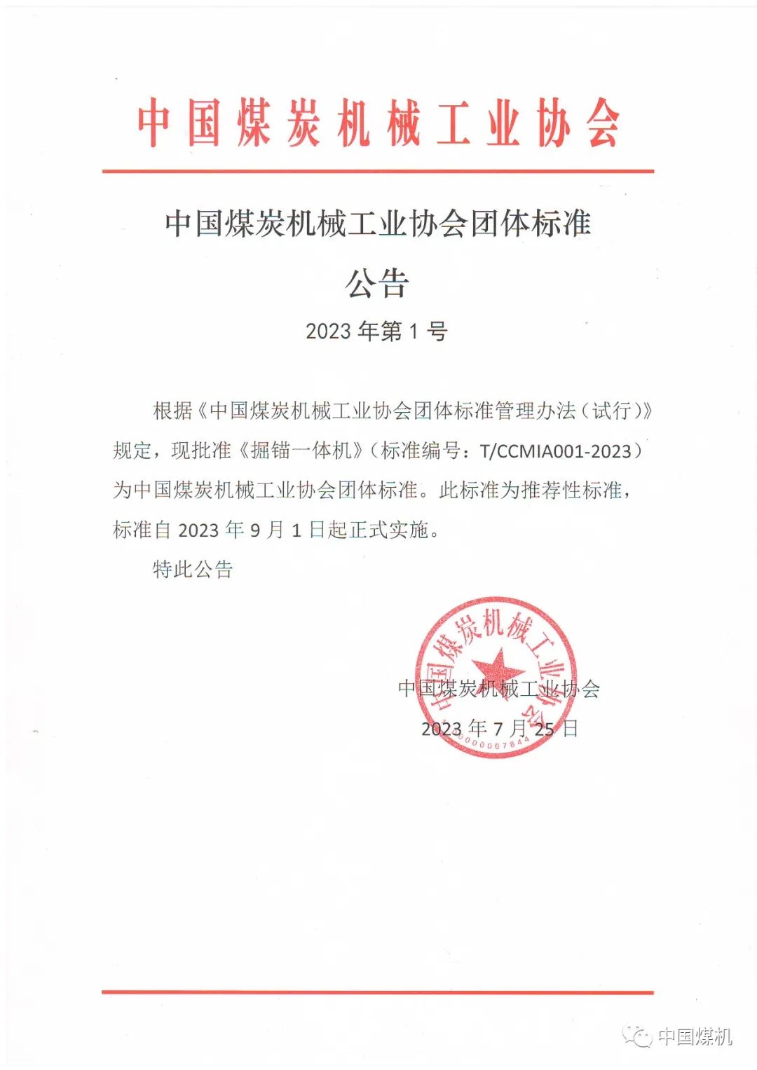 中国煤炭机械工业协会团体标准公告2023年1号