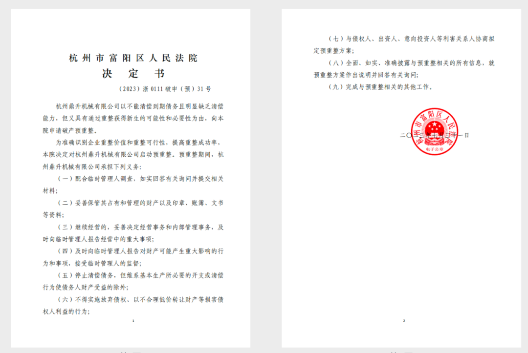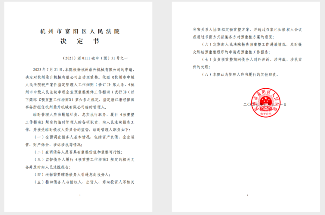 杭州市富阳区人民法院根据杭州鼎升机械有限公司(以下简称“鼎升机械”或“债务人”)的申请,于2023年7月31日决定启动对鼎升机械的预重整程序,并指定浙江浙经律师事务所担任临时管理人。