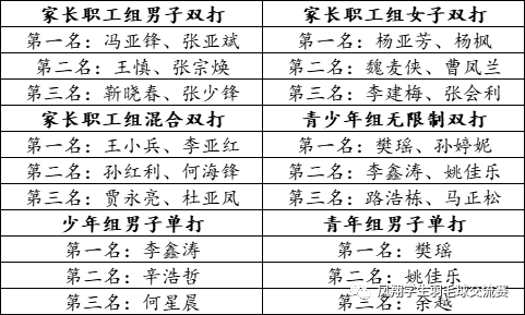 本次比赛共有70多名羽毛球爱好者参加本次比赛,由裁判长李亚红宣布比赛成绩。比赛分家长职工组(男子双打、女子双打、男女混双)与青少年组(少年组男子单打、青年组男子单打、无限制双打)。