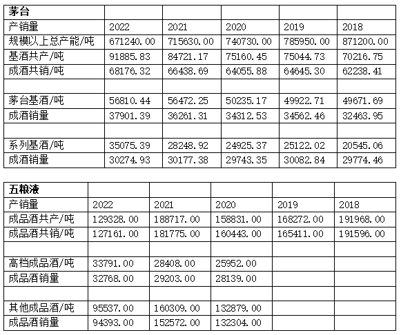 ③市场的总体产量在持续减少,再结合白酒规模以上公司从2017年的1593 家减少到2022年的963家,说明整个行业存在产能过剩的情况。三家公司中,五粮液和泸州老窖的总产、销量在减少,茅台的总产、销量在缓步增加。三家公司的高档酒产、销量均在持续增加。说明市场需要更多的高档白酒。