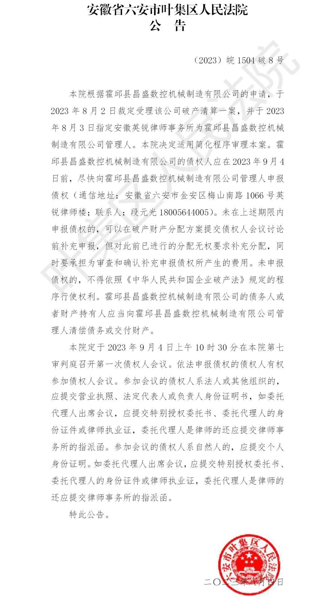 本院根据霍邱县昌盛数控机械制造有限公司的申请,于2023年8月2日裁定受理该公司破产清算一案,并于2023年8月3日指定安徽英锐律师事务所为霍邱县昌盛数控机械制造有限公司管理人。本院决定适用简化程序审理本案。霍邱县昌盛数控机械制造有限公司的债权人应在2023年9月4日前,尽快向霍邱县昌盛数控机械制造有限公司管理人申报债权(通信地址:安徽省六安市金安区梅山南路1066号英锐律师楼;联系人:段元光18005644005)。未在上述期限内申报债权的,可以在破产财产分配方案提交债权人会议讨论前补充申报,但对此前已进行的分配无权要求补充分配,同时要承担为审查和确认补充申报债权所产生的费用。未申报债权的,不得依照《中华人民共和国企业破产法》规定的程序行使权利。霍邱县昌盛数控机械制造有限公司的债务人或者财产持有人应当向霍邱县昌盛数控机械制造有限公司管理人清偿债务或交付财产。