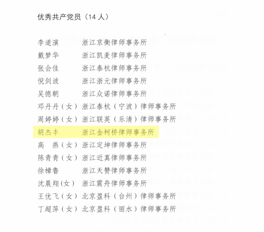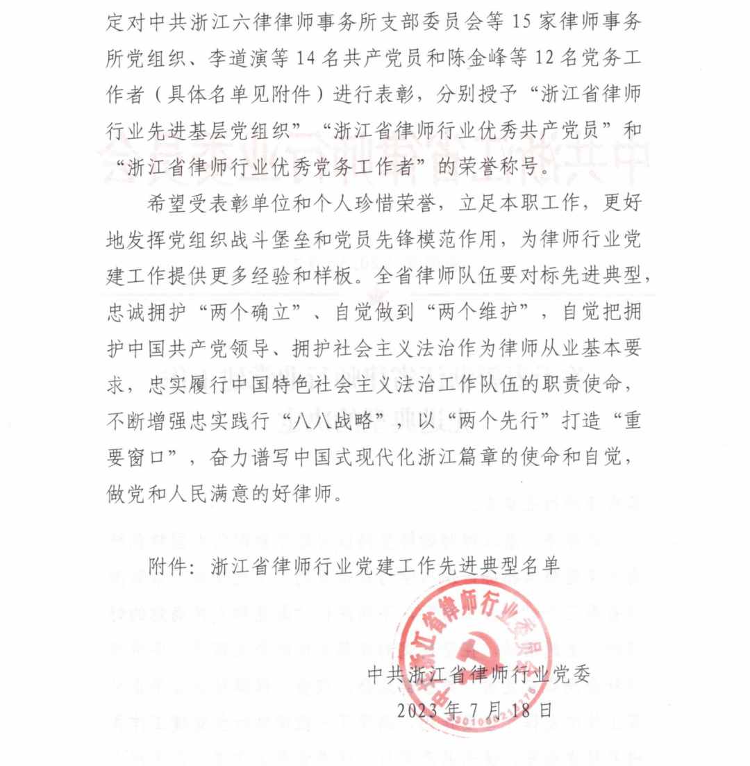 其中,我所主任胡杰丰律师荣获“浙江省律师行业优秀共产党员”荣誉称号。