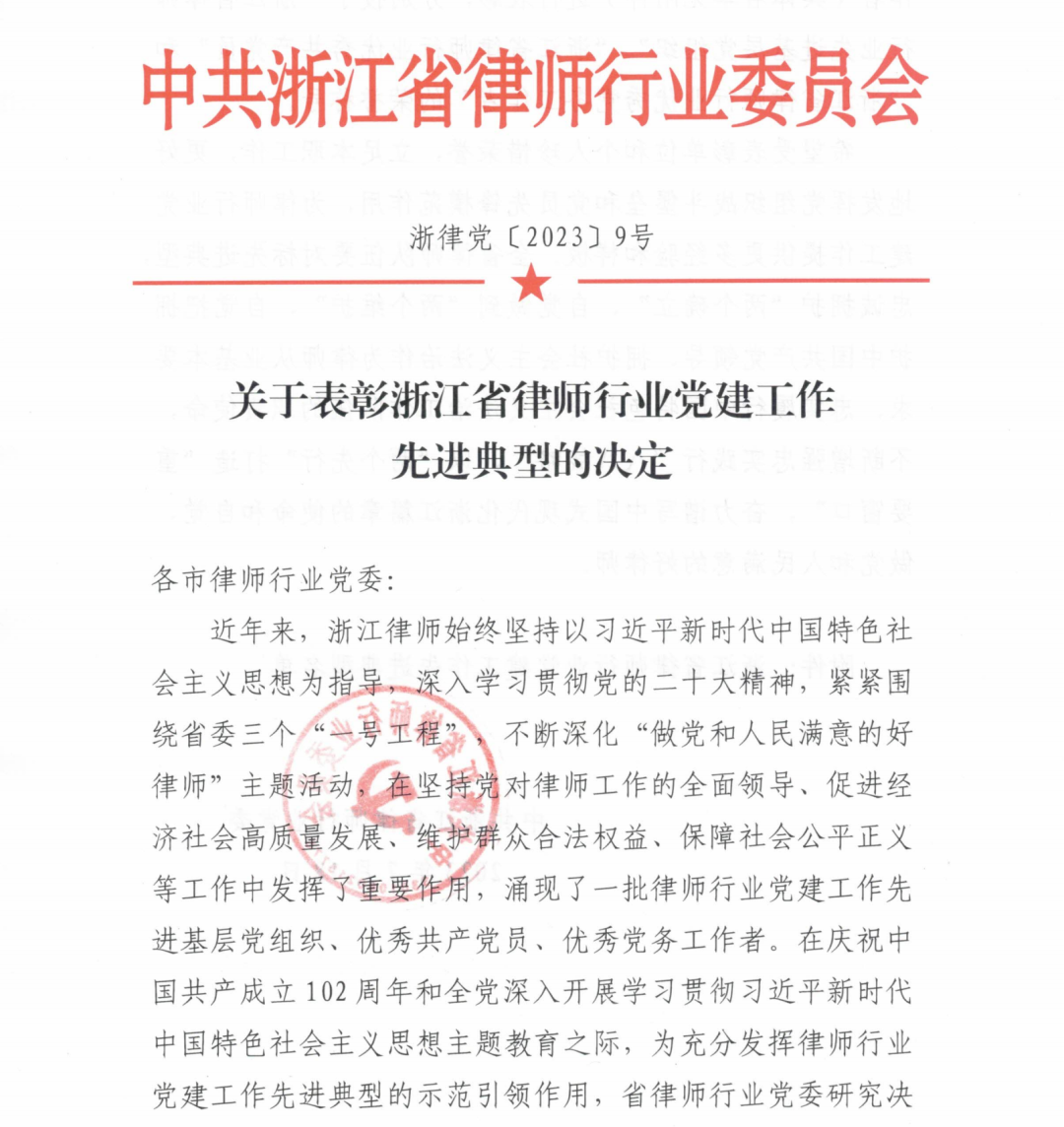 近期,浙江省律师行业党委办公室发布浙律党(2023)9号文件“关于表彰浙江省律师行业党建工作先进典型的决定”,为充分发挥律师行业党建工作先进典型的示范引领作用,省律师行业党委研究决定对省内15家律师事务所党组织、14名共产党员和12名党务工作者进行表彰。