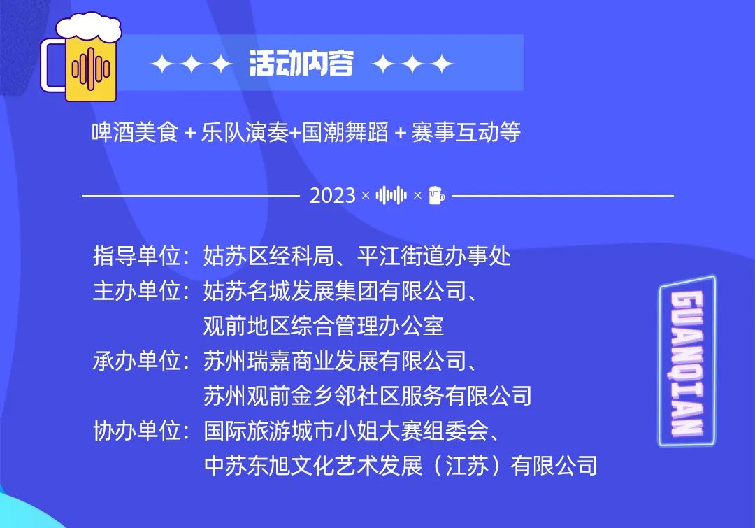 为了进一步扩大观前街区品牌知名度,营造创意特色的街区氛围,助力苏州夜生活提档升级,繁荣活跃消费市场,为商圈增添新活力。泰山原浆夏日嘉年华暨2023观前啤酒美食节以“仲夏之梦 FUN肆潮玩季”为主题,以“苏新消费”为系列活动的延续,展现姑苏新风貌,致力于打造一场专属观前街的狂欢盛宴和老百姓共同参与的仲夏休闲盛会。