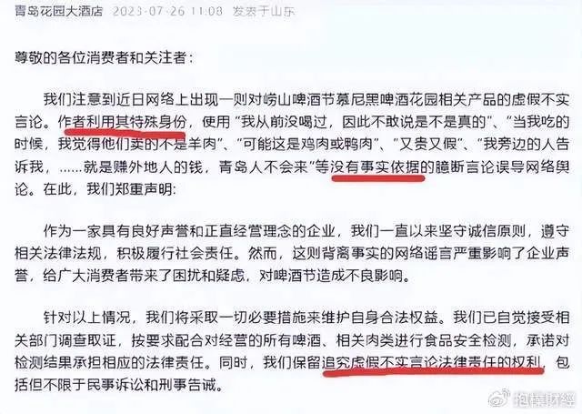 7月26日,涉事商家青岛花园大酒店居然反击了,说是该女子是利用自己“特殊的身份误导消费者,没有事实依据,我们会保留运用法律维护自身利益的权利”。