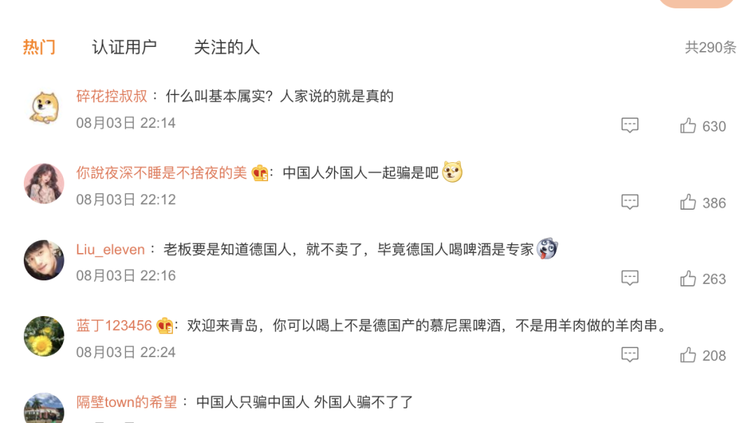 7月21日,德国姑娘海雯娜在崂山参加青岛啤酒节活动时,点了两升号称是来自慕尼黑的纯正德国啤酒和8个羊肉串,啤酒是90块钱一升,羊肉串15元一串。