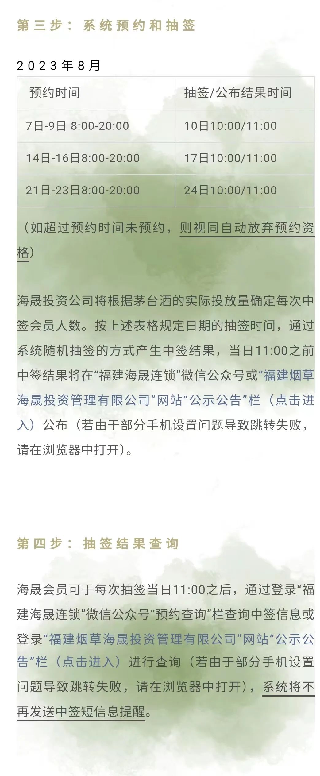 预约数量:2023年8月份计划投放9400瓶,总计中签人数4700名。分三个批次投放(分别为4400瓶2200人,3000瓶/1500人,2000瓶1000人)中签会员没人可预约购买2瓶53%vol500ml贵州茅台酒(带杯)陪茅台手提袋一个,不提供整箱外包装,每月购买最多不超过一次,每年最多不超过6瓶。预约抽签资格:注册日期在2023年6月30日(含)之前年满十八周岁的海晟会员;2023年7月份自然月,在福建海晟连锁直营门店(含海晟商城、海晟通仙茶社)消费非烟品次数达到3次(含)以上(不含购买茅台酒,同一天内多次消费记录只计算一次,退货或已经取消的订单不计入消费次数)