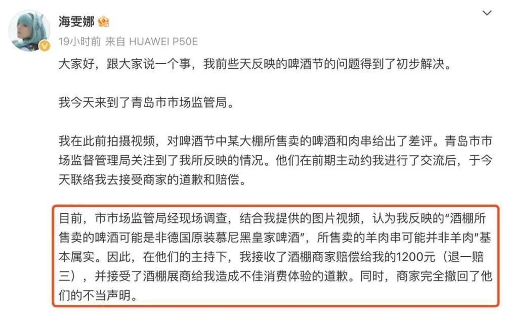 最后,青岛市监局站出来说话了,他们认可了海雯娜的质疑,并宣布涉事商家假一赔三。