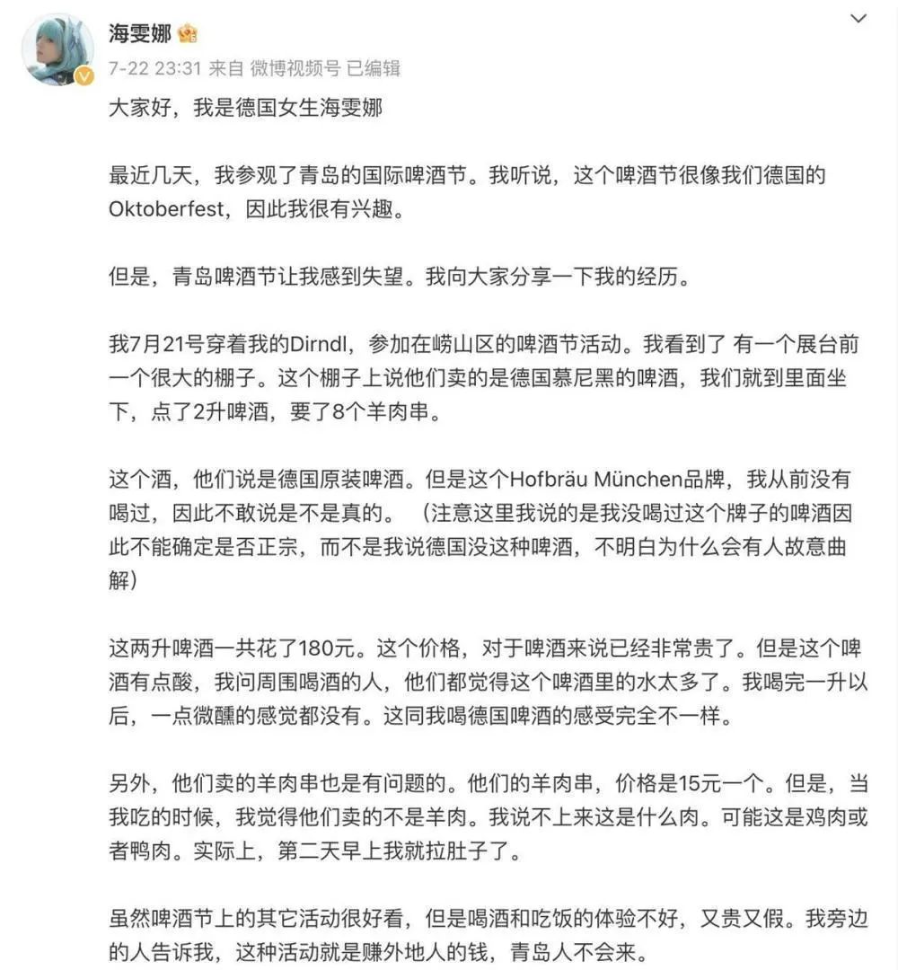 一位德国女孩海雯娜参加青岛啤酒节后,质疑所喝的啤酒和吃的羊肉是否“地道”,而网友们却不客气地称她为“假洋人”。