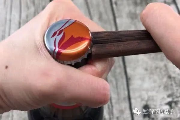 进餐时当然少不了筷子,其实筷子还可以用来开瓶盖。方法很简单,我们只需要用一只手抓住啤酒瓶盖下方的位置,然后再把筷子对齐,用筷子粗的一端放在瓶盖与大拇指之间,接着用力往上翘,就能快速打开瓶盖了。