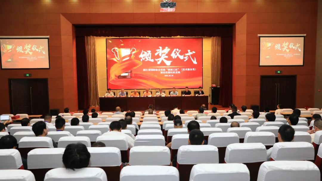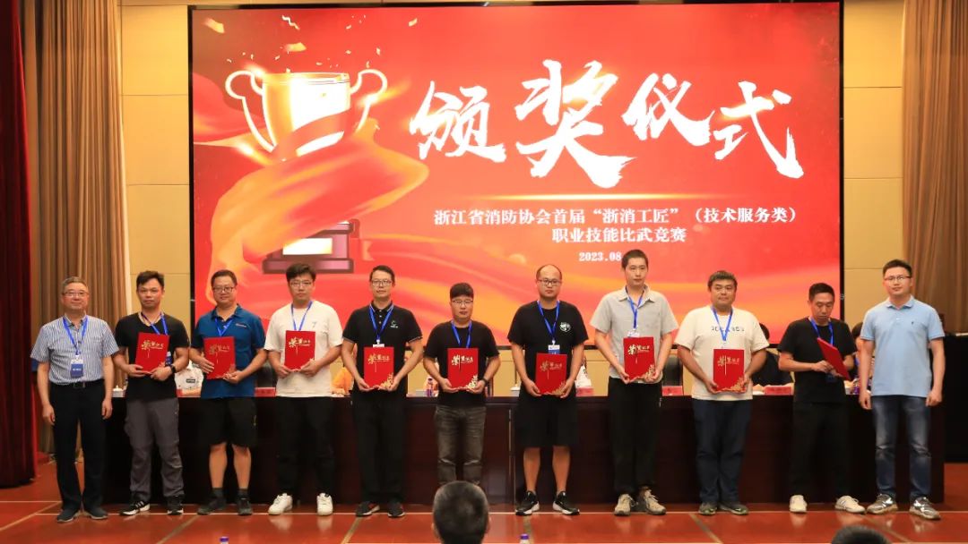为贯彻省委、省政府高质量发展战略,弘扬“浙派工匠”精神,提升消防企业员工专业技能水平,结合消防行业特点和“迎亚运·保平安”要求,经过五个月的精心准备和紧密筹办,8月4日至5日,由浙江省消防协会主办,协会消防技术服务分会承办,浙江警官职业学院和消防科普教育培训工作委员会协办,全国安防职教联盟和浙江省应急联盟支持的浙江省消防协会首届“浙消工匠”(技术服务类)职业技能比武竞赛在浙江警官职业学院成功举办并隆重召开颁奖大会。浙江省消防协会会长洪巨平、常务副会长徐荣敏、副会长陶李华出席会议,浙江警官职业学院院长周敏华、浙江省人力资源和社会保障厅评价中心竞赛指导科干部林春苗应邀莅临大会,协会专家委员会主任委员许世文、社会民间消防力量工作委员会主任委员王伟等分支机构负责人也参加大会并观摩。会议由协会常务副会长徐荣敏主持。