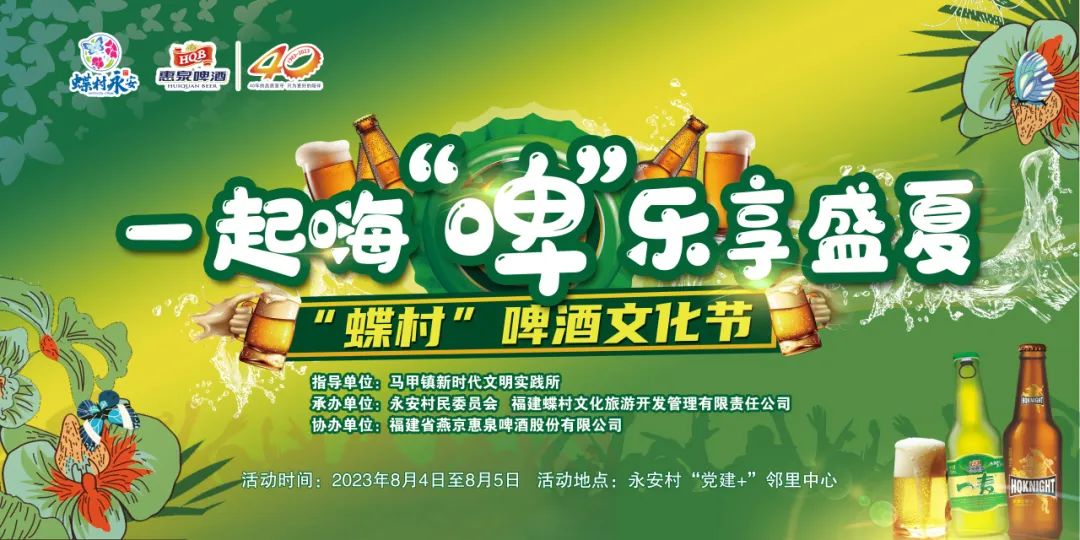 本次“蝶村”啤酒文化节由马甲镇新时文明实践所指导,永安村民委员会、福建蝶村文化旅游开发管理有限责任公司主办,福建省燕京惠泉啤酒股份有限公司协办,旨在提升永安村“党建+”邻里中心知名度,激发“蝶村”市场活力,扩大夜间消费,增加村集体经济收入,带动区域经济发展。