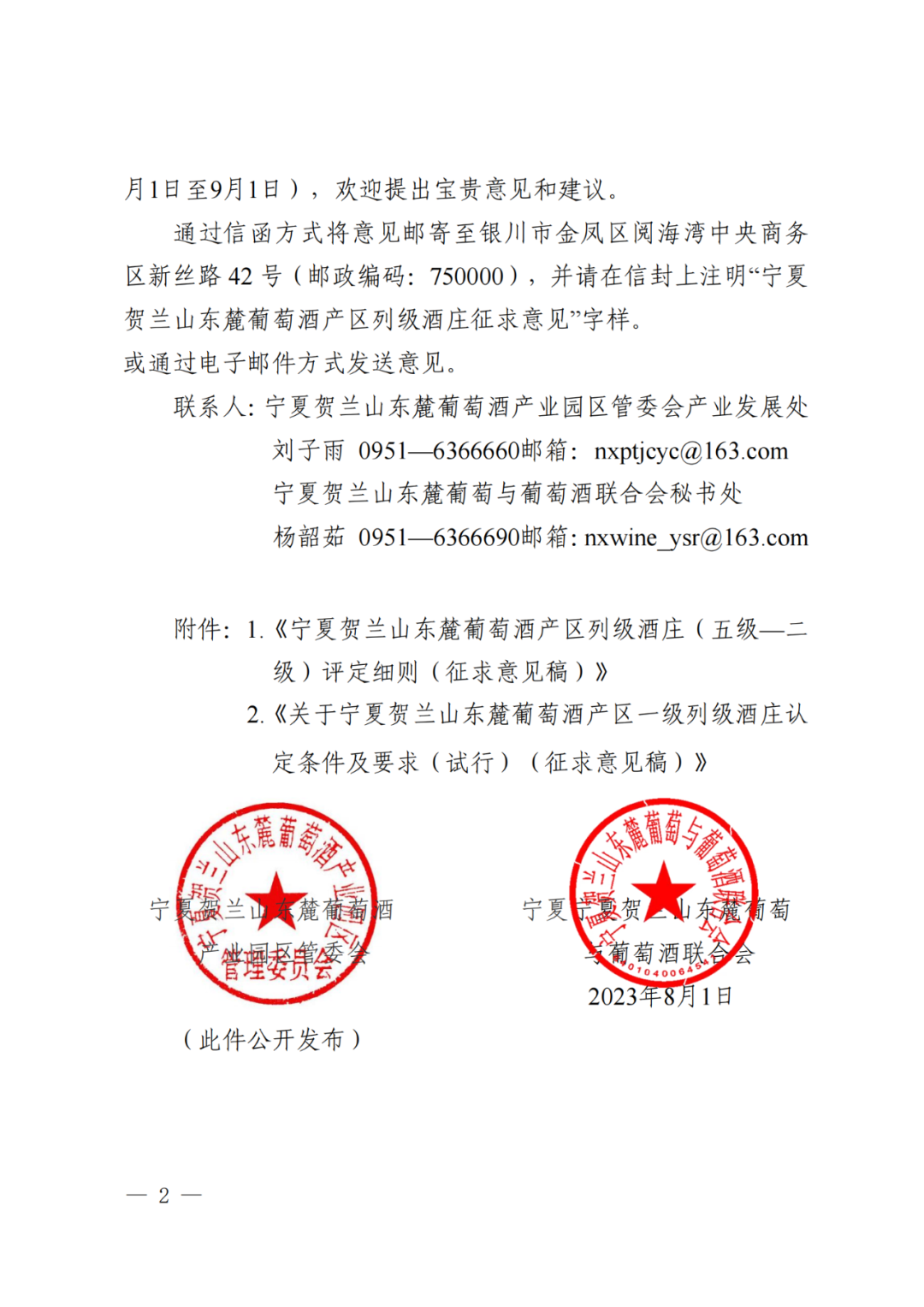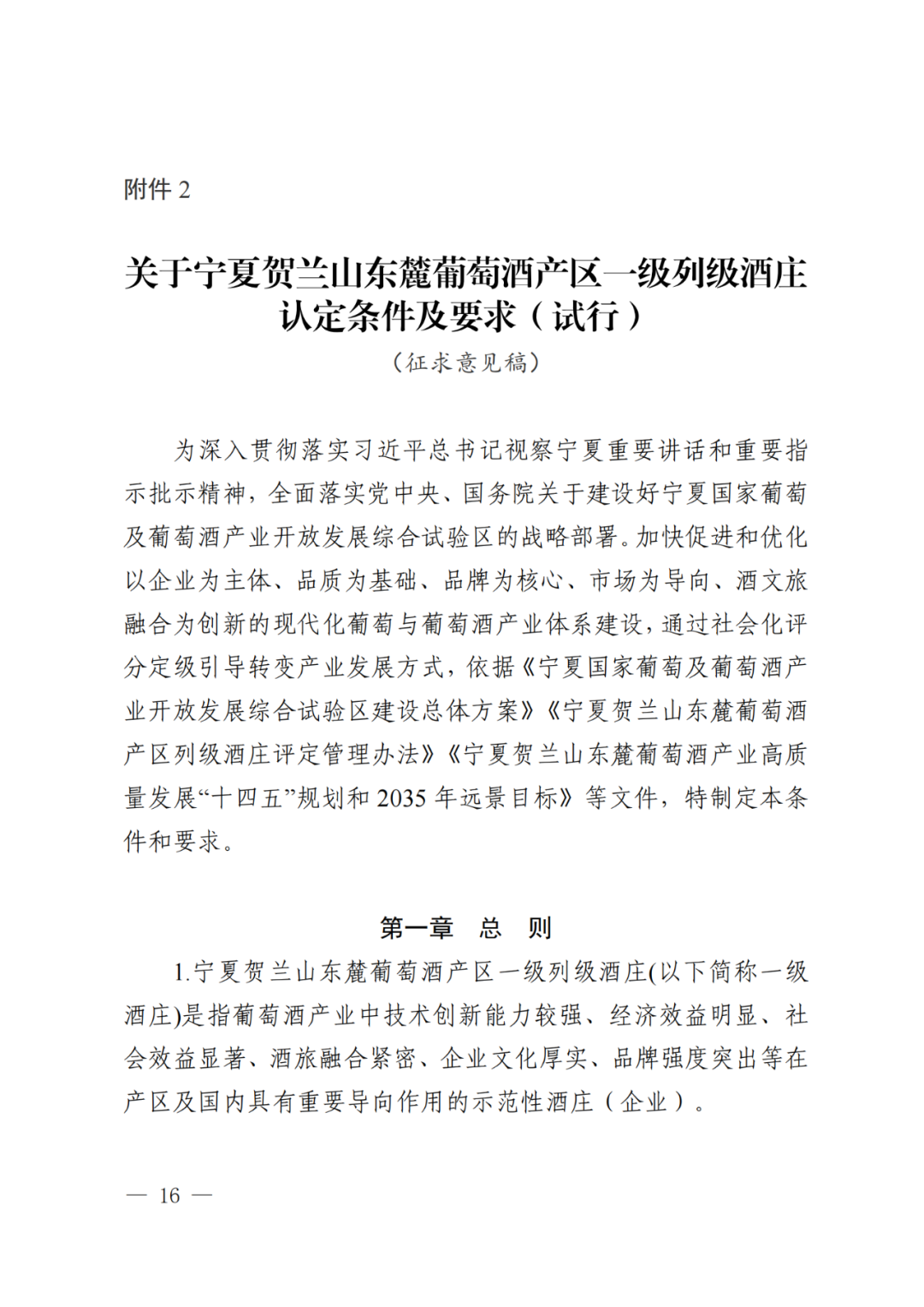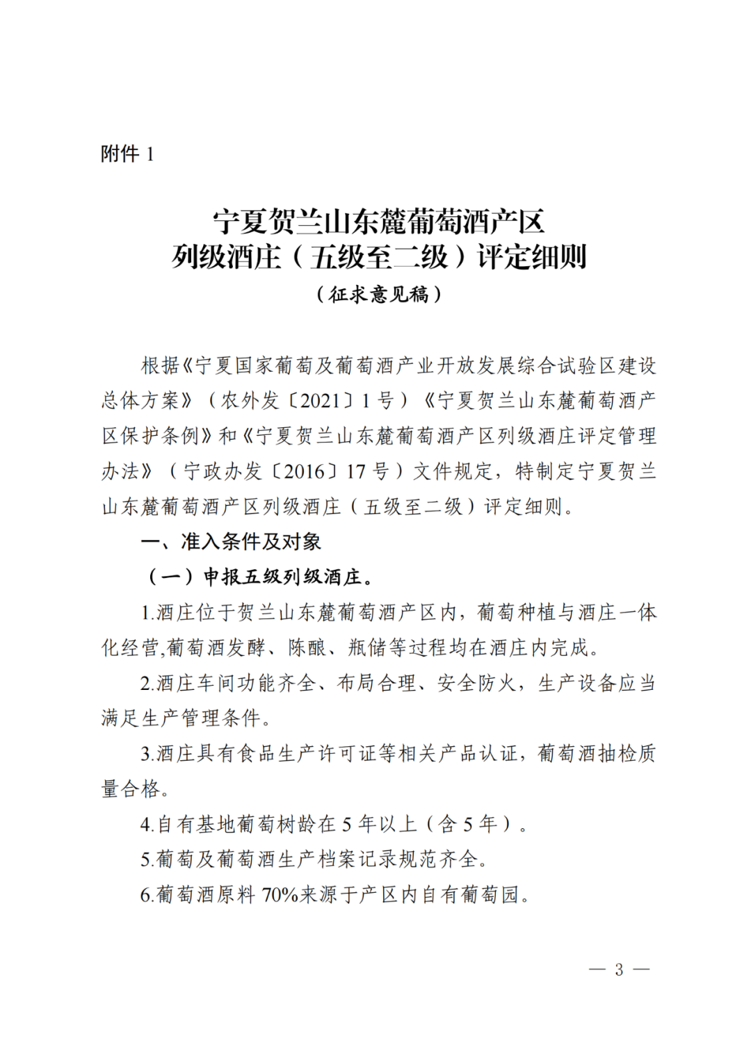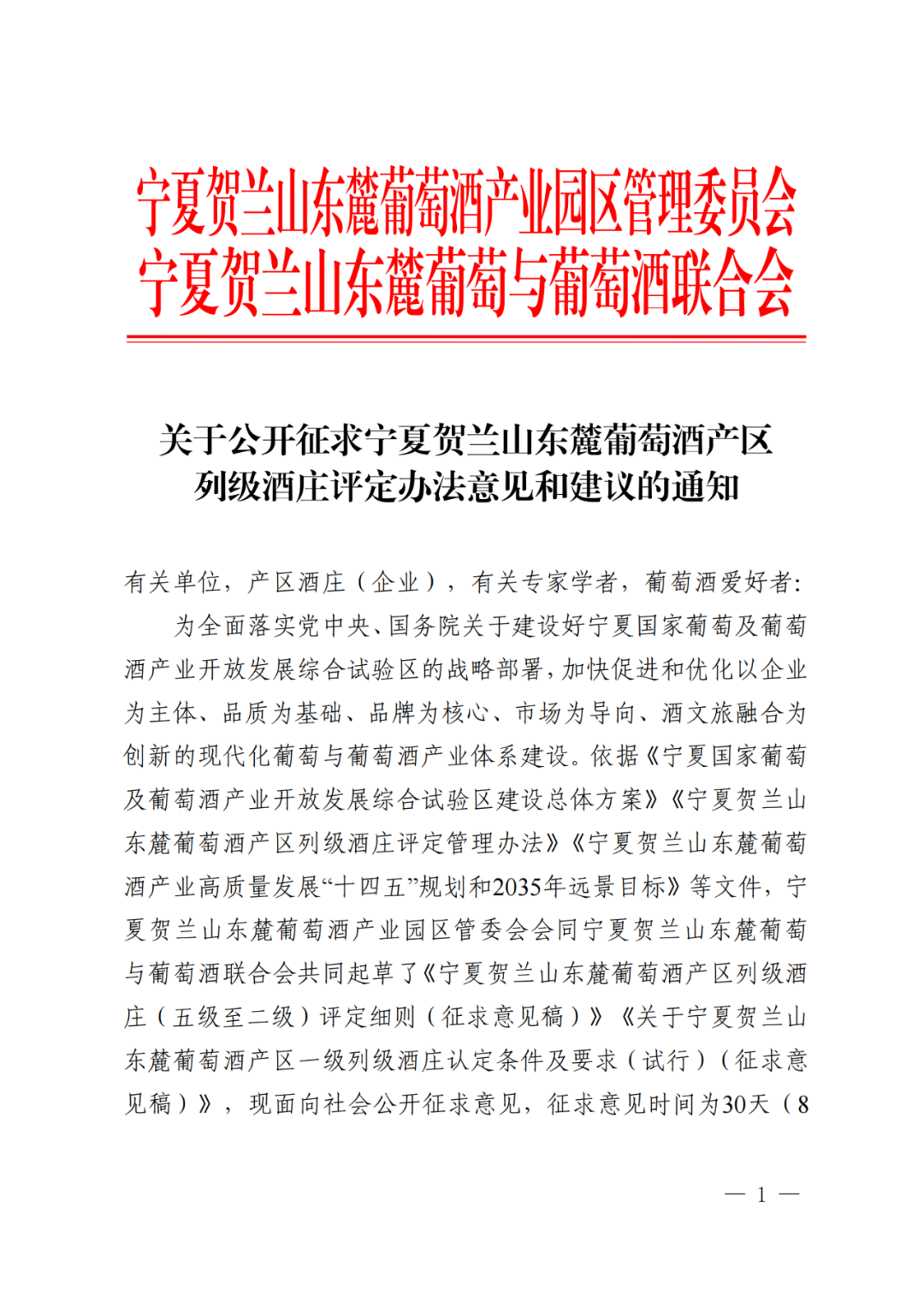 宁夏贺兰山东麓葡萄酒产区列级酒庄评定办法意见和建议公开征求意见