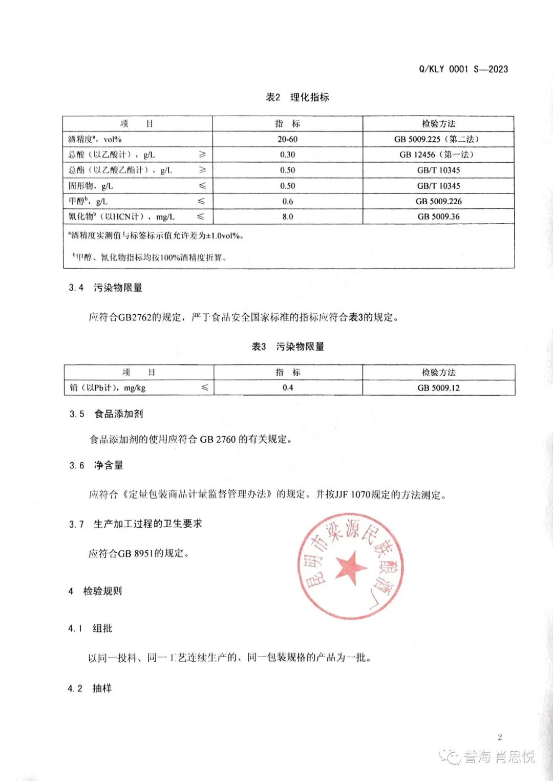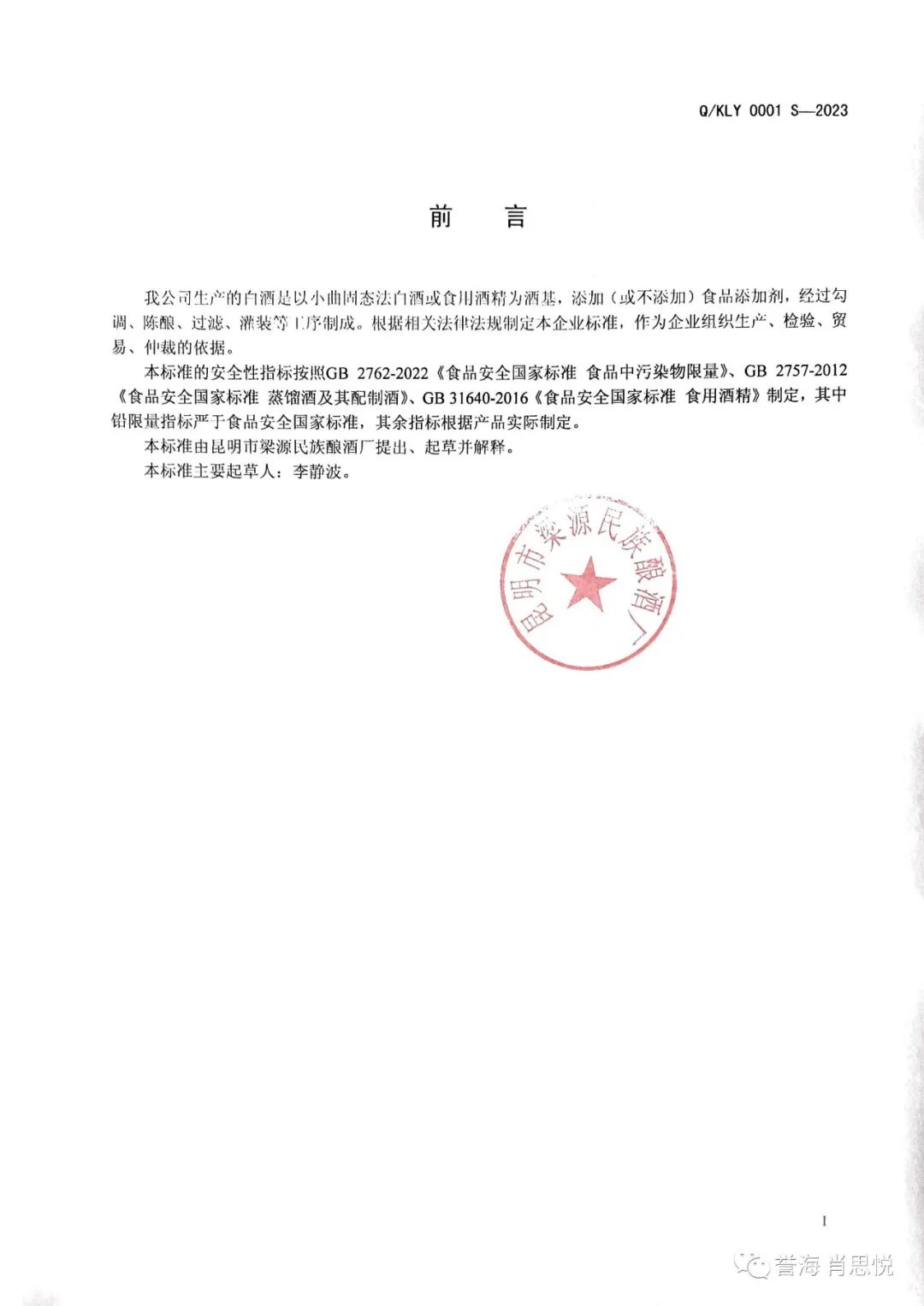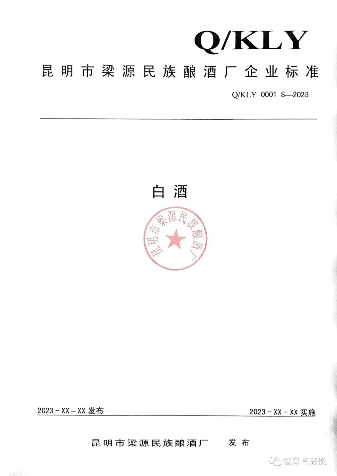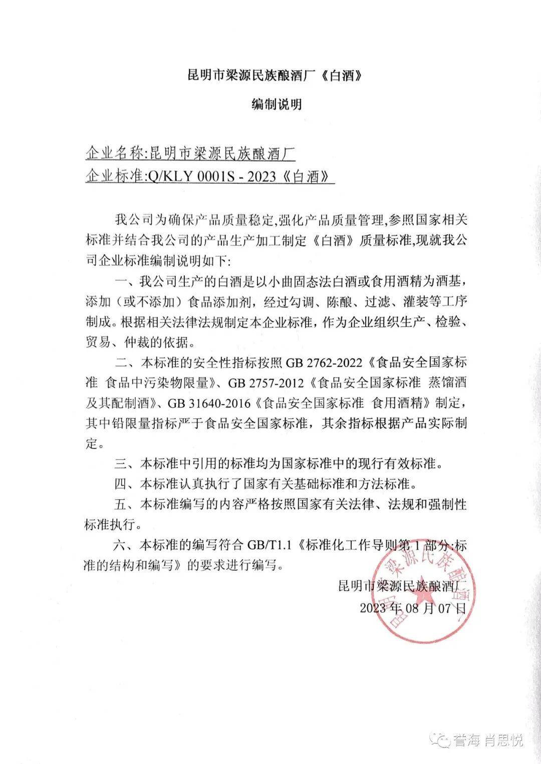 昆明市梁源民族酿酒厂《白酒》Q/KLY 0001 S-2023企业标准备案前公示(企业标准+编制说明)