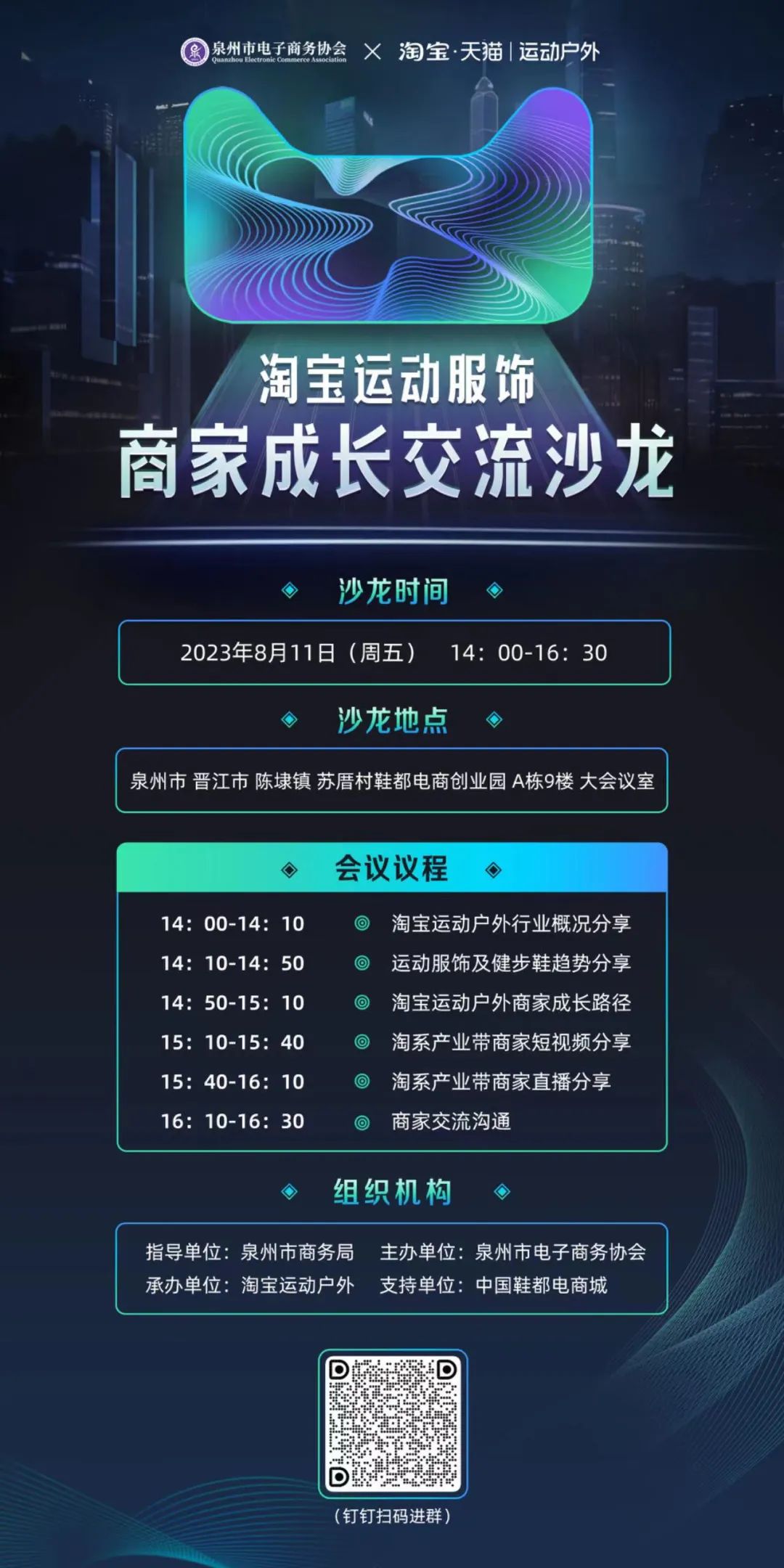 我会将于2023年8月11日下午14:00-16:30,在中国鞋都电商创业园A栋9楼大会议室举办——淘宝运动服饰商家成长交流沙龙,交流运营成功案例,分享先进经验,助力商家在淘宝平台取得高质量发展。