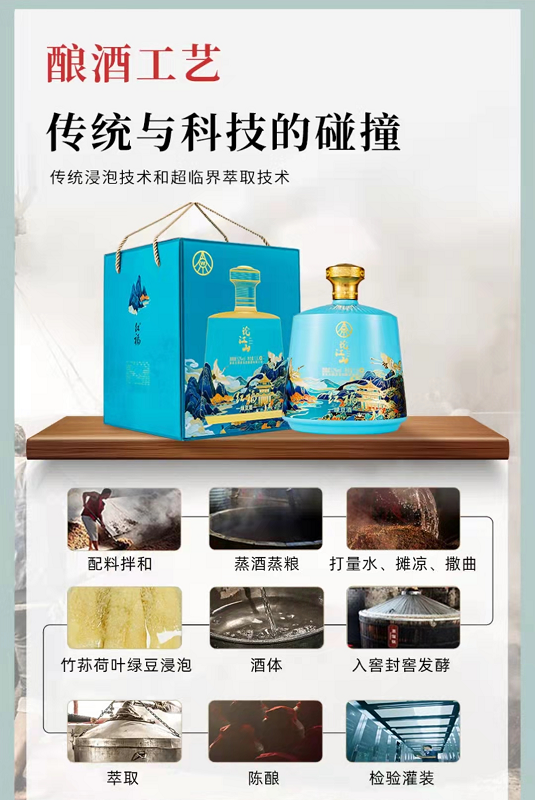 3、精选药食同源的竹荪、绿豆、荷叶等原材,与五种粮食原料所酿的基酒相融合,滴滴美酒足以称得上是“玉露琼浆”!