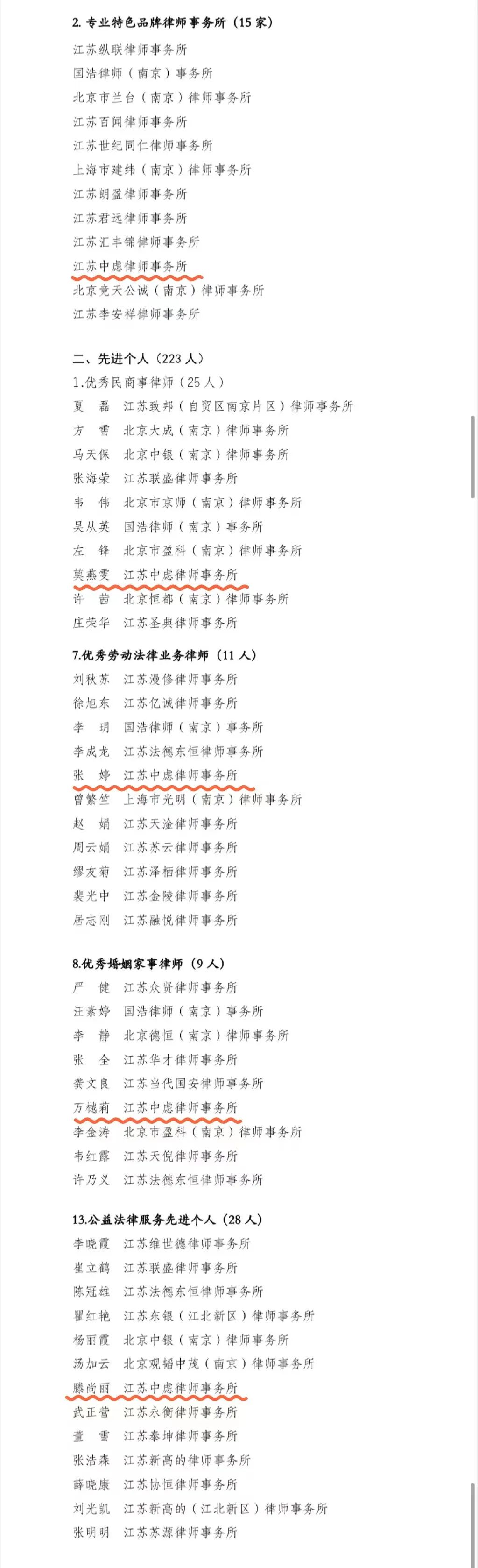 为进一步在南京市律师行业中弘扬正气、鼓励先进和树立典型,促进南京市律师行业健康发展,市律协决定对2020-2022年度为行业发展和协会建设作出积极贡献的先进集体和先进个人进行表彰,经申报评定后,江苏中虑律师事务所在此次表彰中荣获“专业特色品牌律师事务所”,莫燕雯律师荣获“优秀民商事律师”,张婷律师荣获“优秀劳动法律业务律师”,万樾莉律师荣获“优秀婚姻家事律师”,滕尚丽律师荣获“公益法律服务先进个人”。