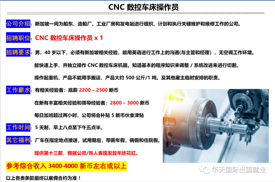 新加坡机械公司招聘CNC数控车床操作员,男,40岁以下,必须有新加坡相关经验。
